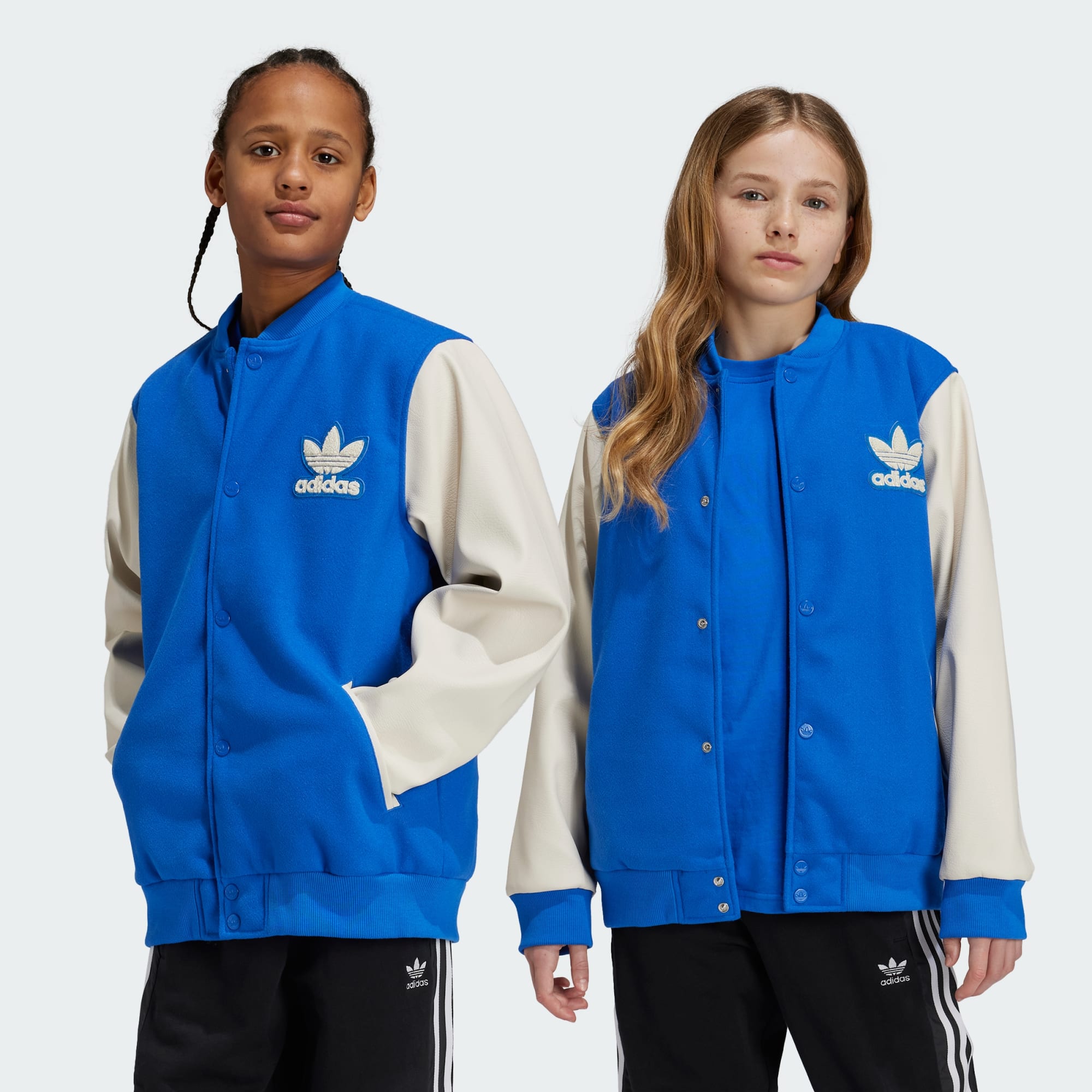 This juniors' jacket is made in velvet for a soft, luxe feel. A Trefoil logo on the chest connects you to adidas' storied legacy while the silhouette and colourblocking give it a collegiate look. Its versatile style and easygoing vibe make it the perfect addition to any outfit. This product is made with 100% recycled materials. By reusing materials that have already been created, we help to reduce waste and our reliance on finite resources and reduce the footprint of the products we make.