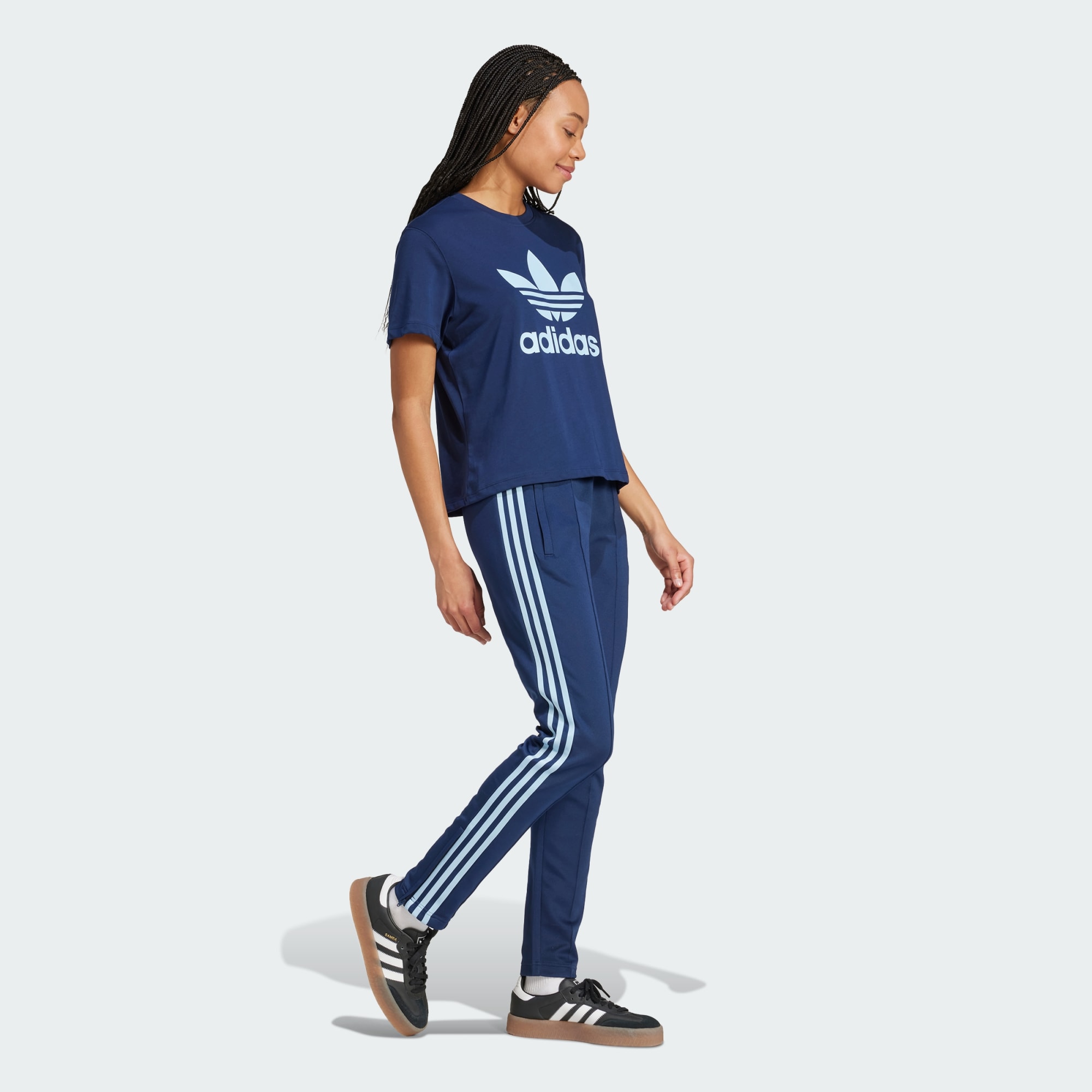 Make yourself comfortable in these adidas track pants. The slim fit keeps your lines clean, while stretchy doubleknit gives you freedom to move. Tall 3-Stripes down the legs call on that sporty heritage. Complete the look with a coordinating track jacket and a contrast crop top, and you're all set for your day — no matter what you have planned. A minimum of 70% of this product is a blend of recycled and renewable materials.