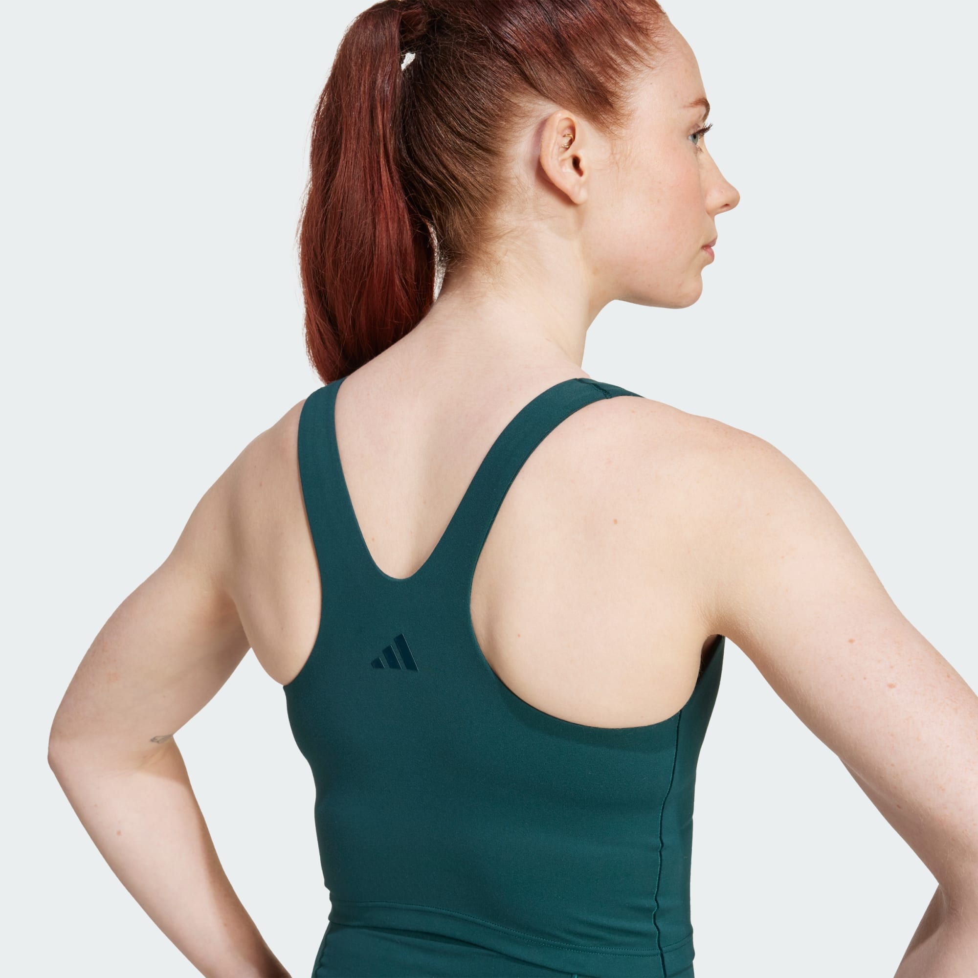 Challenge yourself during barre, sculpt or cardio classes in this adidas bra. Medium support allows you to flow freely through workouts with ease and comfort. Smooth AdiSOFT fabric feels feather-light against your skin. The flattering tank silhouette stays in place so you can wear it without a tee. Built-in pads deliver coverage with a natural shape.