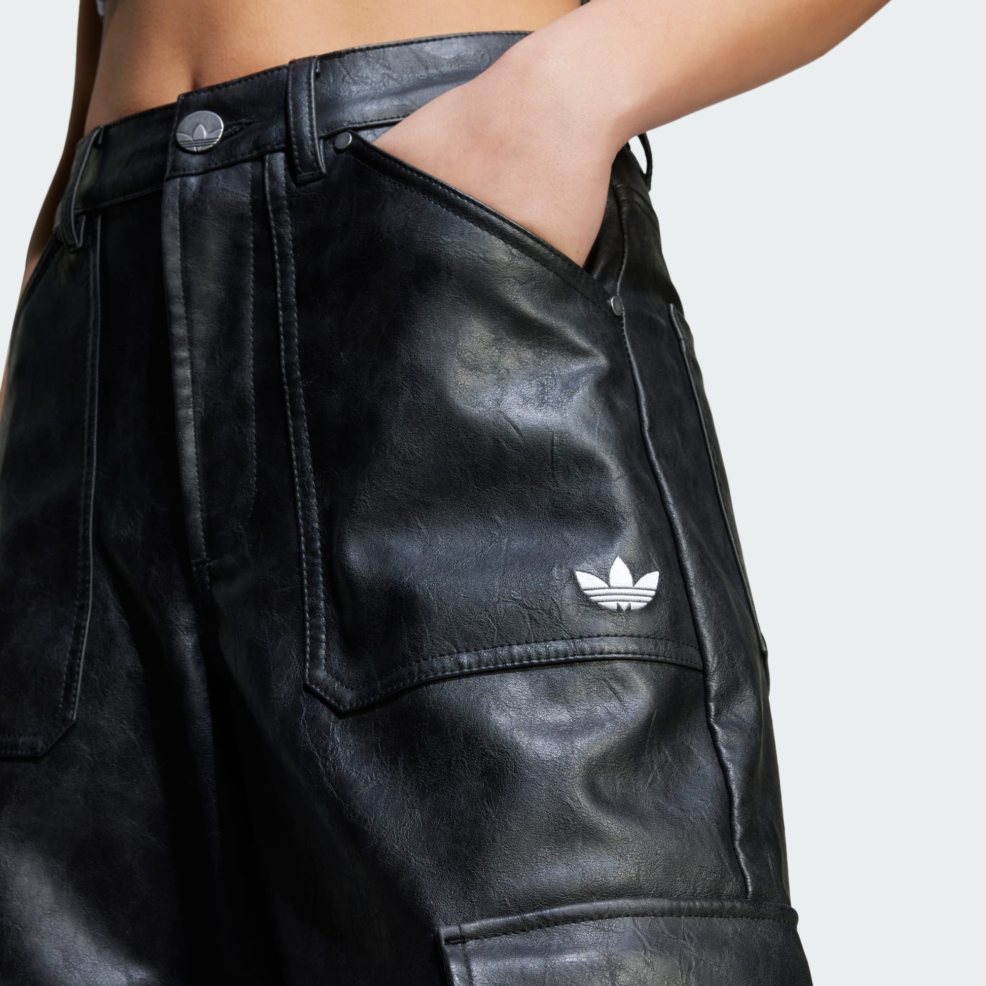 The oversized shape of these adidas pants on its own makes a statement. But then you add in the faux-leather materials, and the perfect blend of slouch, sheen and sass come together and make these pants unforgettable. The ties on the bottom let you cinch the ankles, emphasising the loose shape even further. This product is made with at least 70% recycled materials. By reusing materials that have already been created, we help to reduce waste and our reliance on finite resources and reduce the footprint of the products we make.