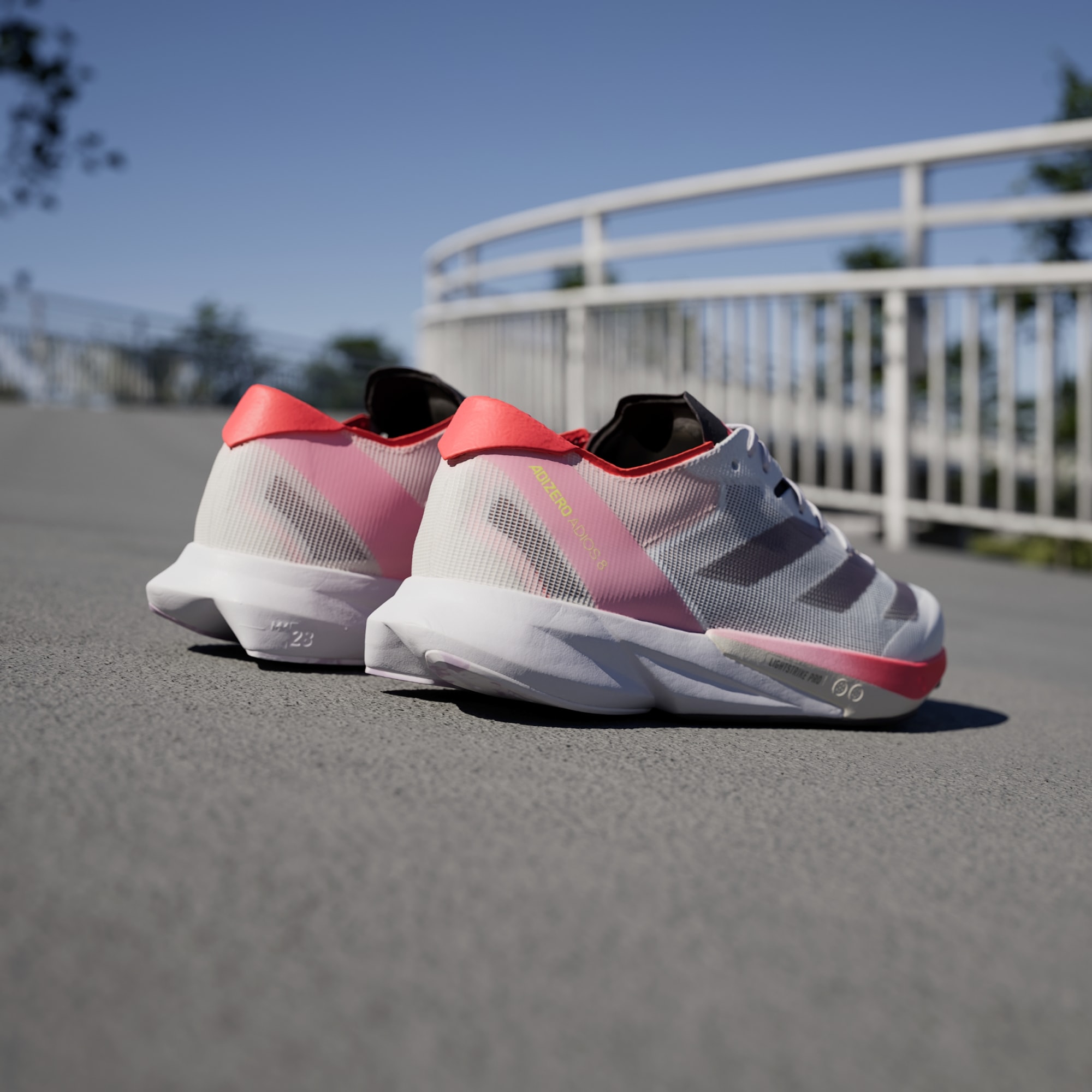 Chase your next PR in these Adizero Adios 8 shoes. The new-breathable lightweight mesh upper rides on a mix of superlight LIGHTSTRIKE 2.0 and LIGHTSTRIKE PRO foam. The hybrid makes these shoes fast enough for race day while being able to withstand daily training. The updated ENERGYTORSION ROD 2.0 is embedded in the midsole and with a new third rod that runs through the midfoot to the forefoot for a snappy toe-off in each stride. The result? A pair of running shoes that help you run faster and longer than ever before — all the while providing a soft stiffness that increases the force transfer.