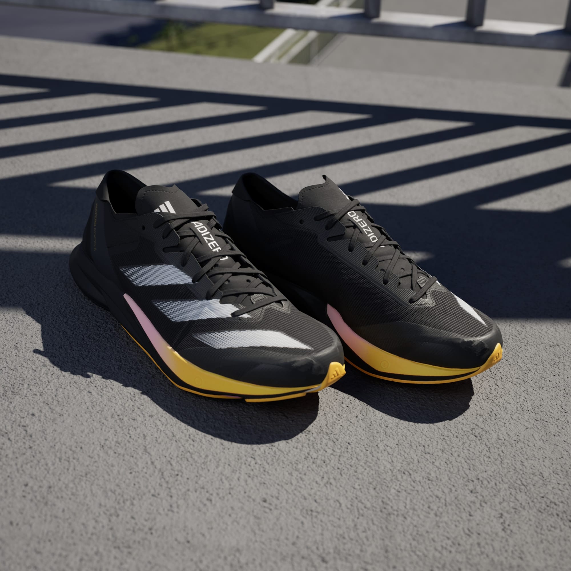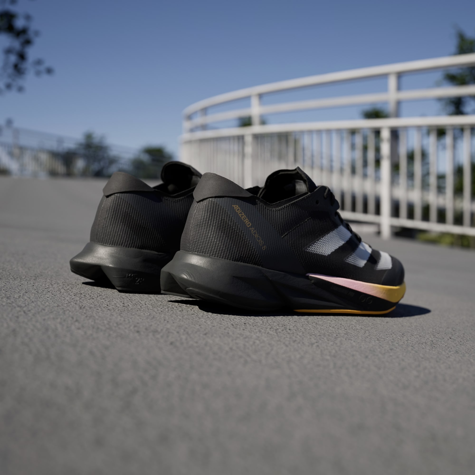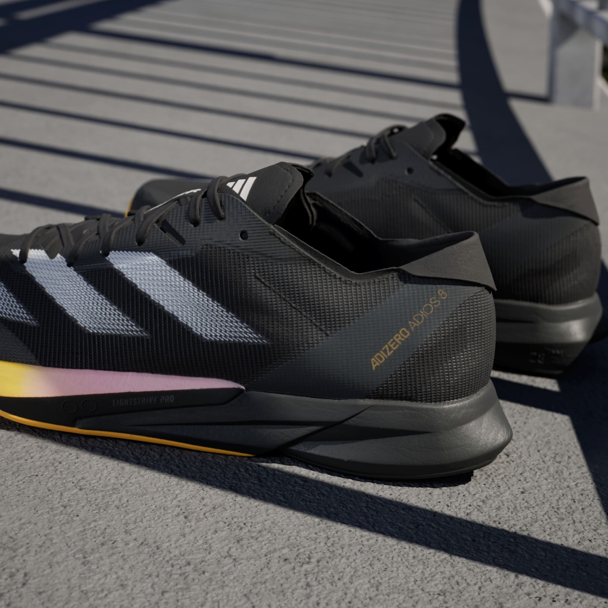 Chase your next PR in these Adizero Adios 8 shoes. The new-breathable lightweight mesh upper rides on a mix of superlight LIGHTSTRIKE 2.0 and LIGHTSTRIKE PRO foam. The hybrid makes these shoes fast enough for race day while being able to withstand daily training. The updated ENERGYTORSION ROD 2.0 is embedded in the midsole and with a new third rod that runs through the midfoot to the forefoot for a snappy toe-off in each stride. The result? A pair of running shoes that help you run faster and longer than ever before — all the while providing a soft stiffness that increases the force transfer.
