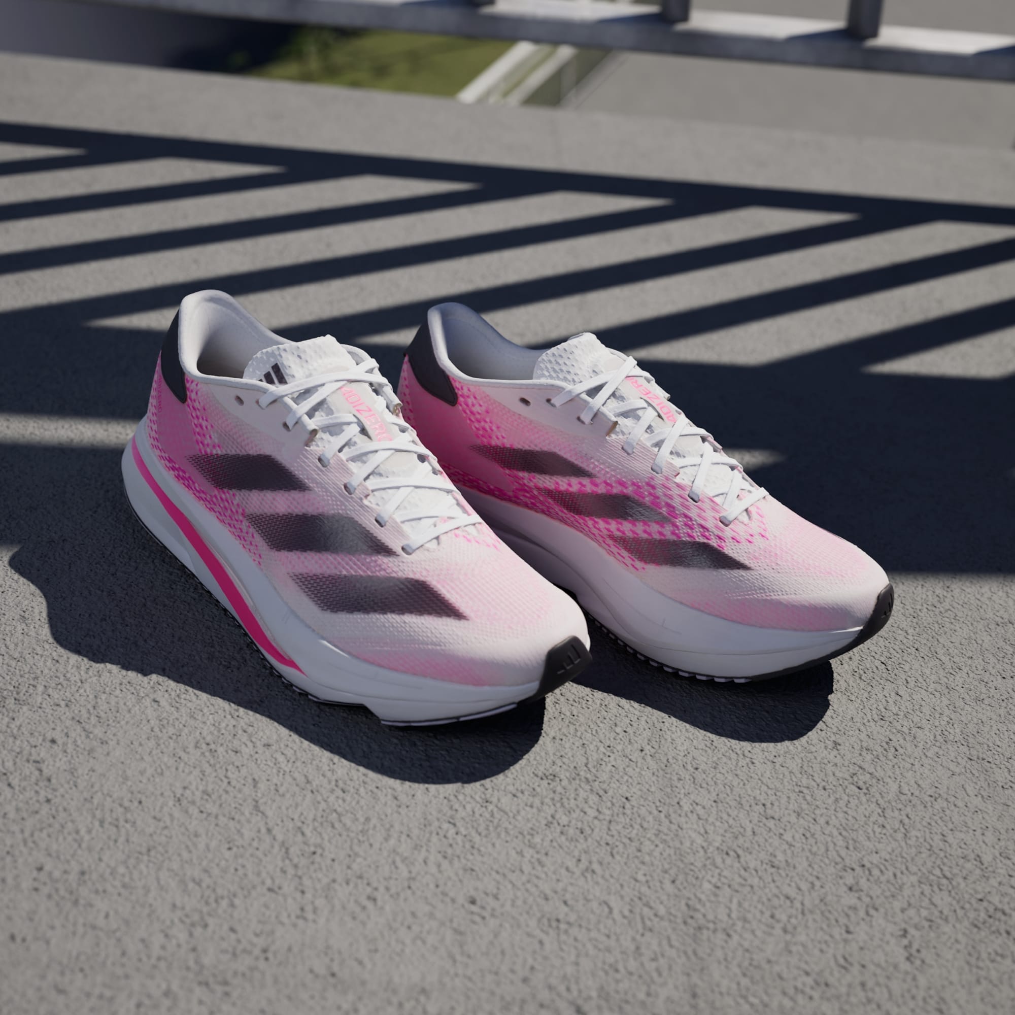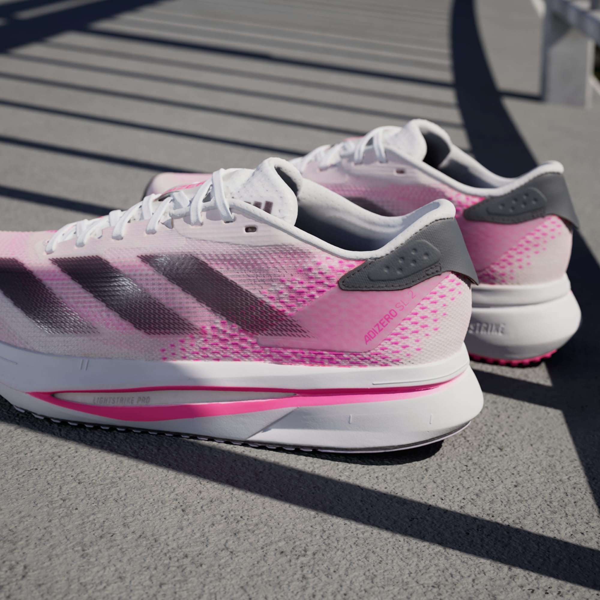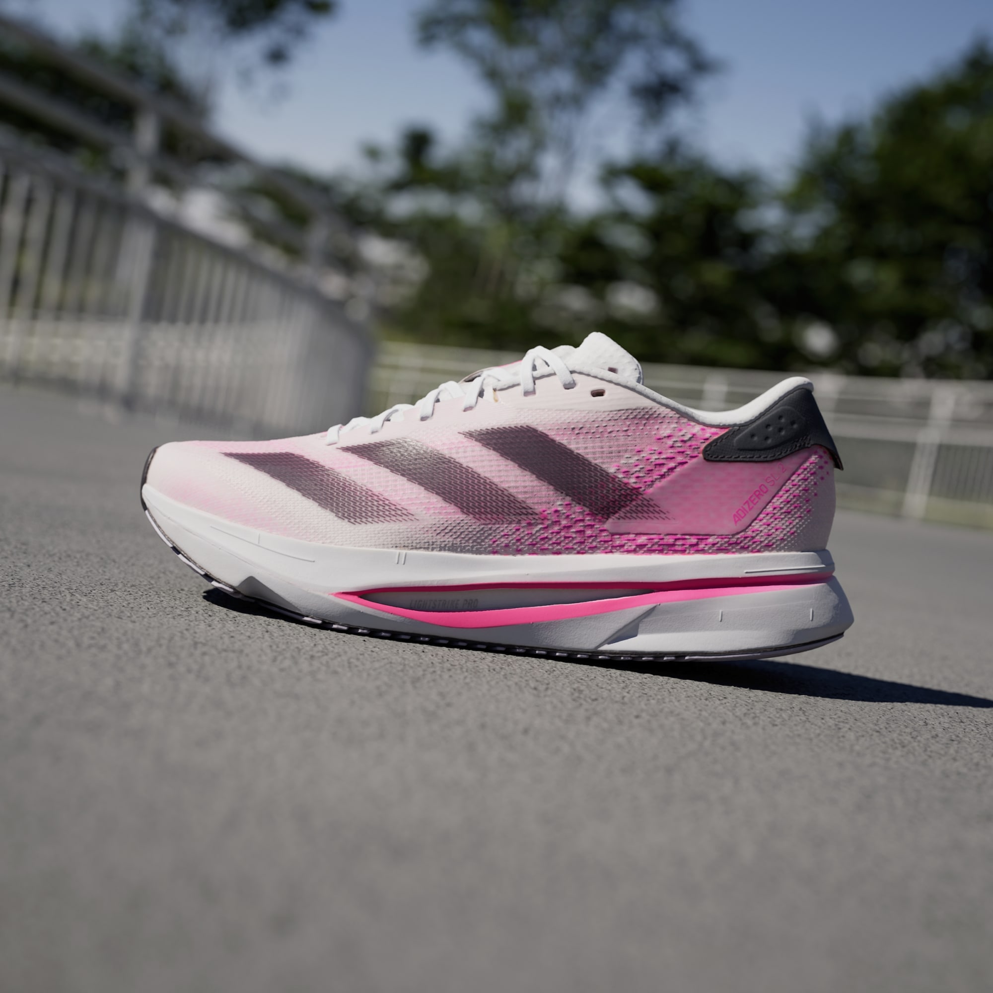 Experience the thrill of breaking personal records in a shoe that's as fast as you are. These adidas Adizero running shoes are equipped with responsive Lightstrike Pro, super-light cushioning that delivers energy return for next-level speed. The engineered mesh upper provides breathability and targeted support where you need it most to keep you flying to the finish.