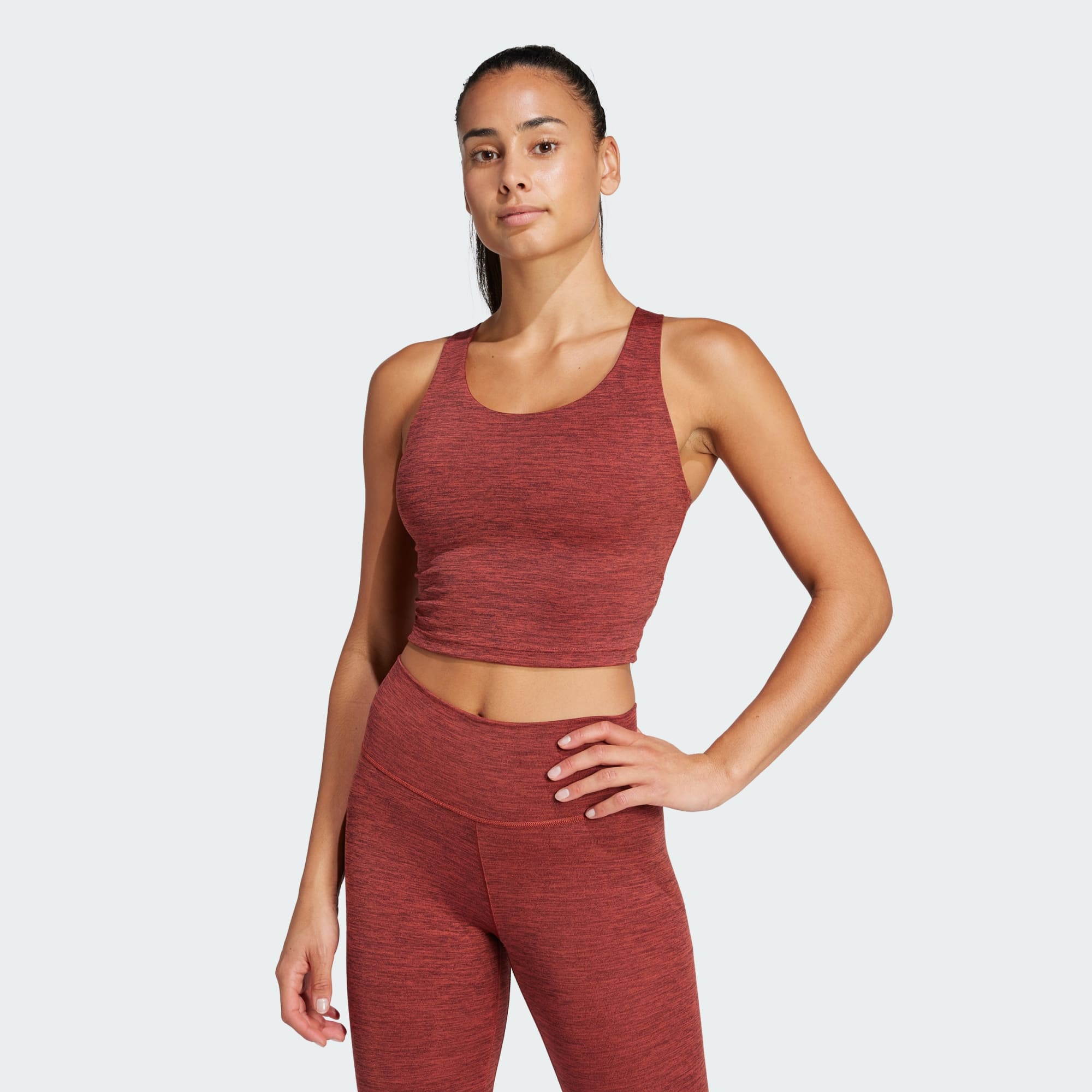 Move through your flow with confidence in this bra tank top. Designed for yoga, barre and gym workouts, this top keeps you covered and comfortable no matter how far you bend or stretch. You'll feel dry thanks to adidas AEROREADY, so you can focus on your practice.