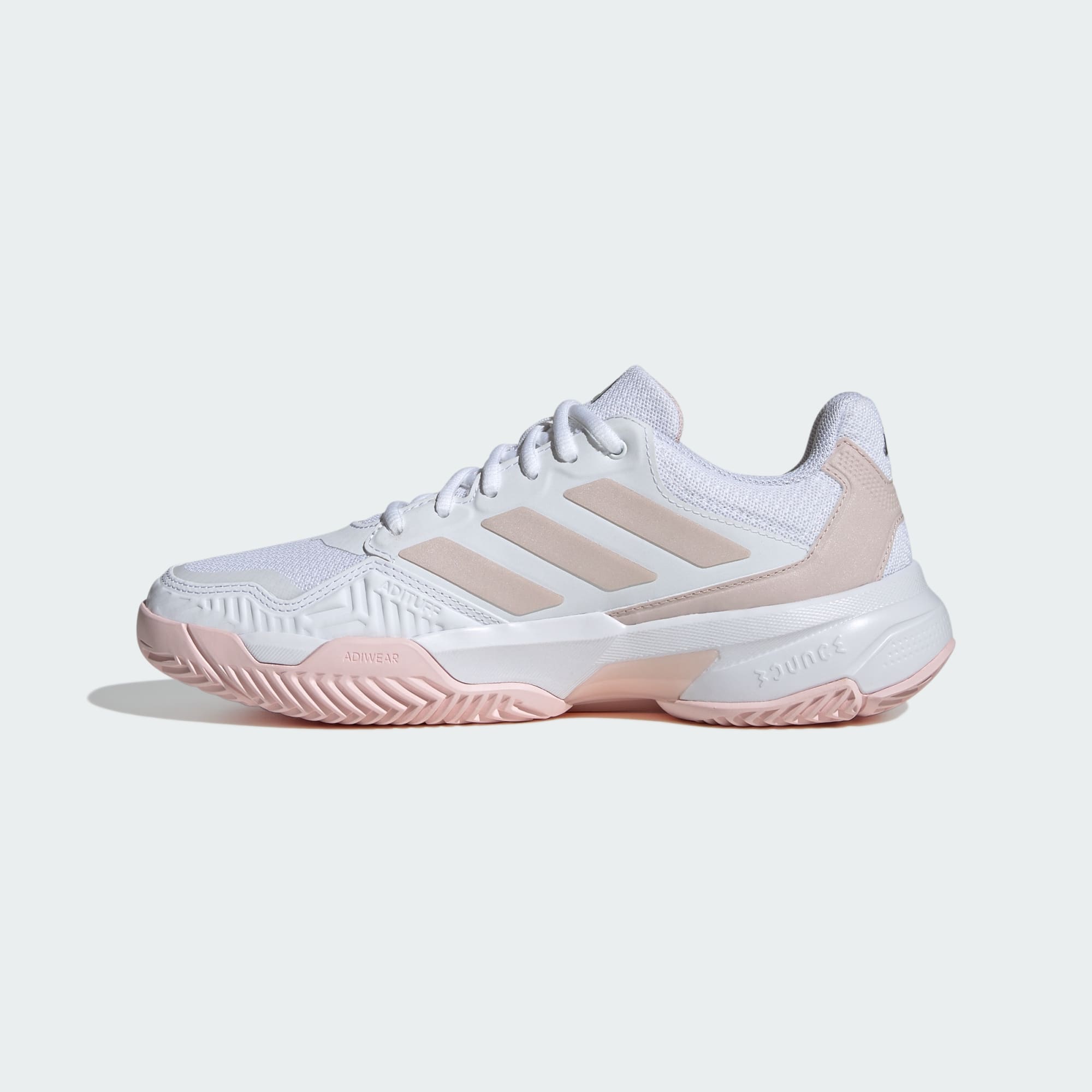 Fine-tuning your forehand or battling for match point, these adidas tennis shoes give you comfort and control. Adituff wraps around the toe area to protect against foot drag while the mesh upper allows air to circulate as the competition heats up. A split herringbone tread keeps you gripped through quick stop-and-go movements and lightweight Bounce cushioning adds springiness. The Torsion System provides stability during quick cuts and slides, helping you cover more court.