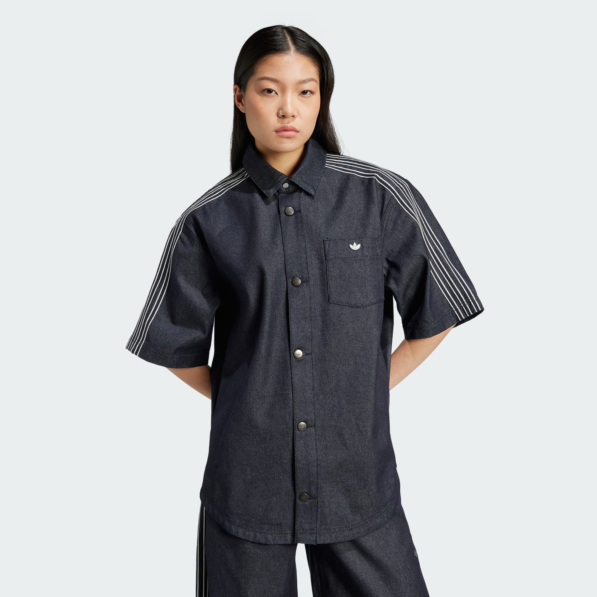 An all-denim shirt with buttons in front and 3-Stripes down the sleeves.