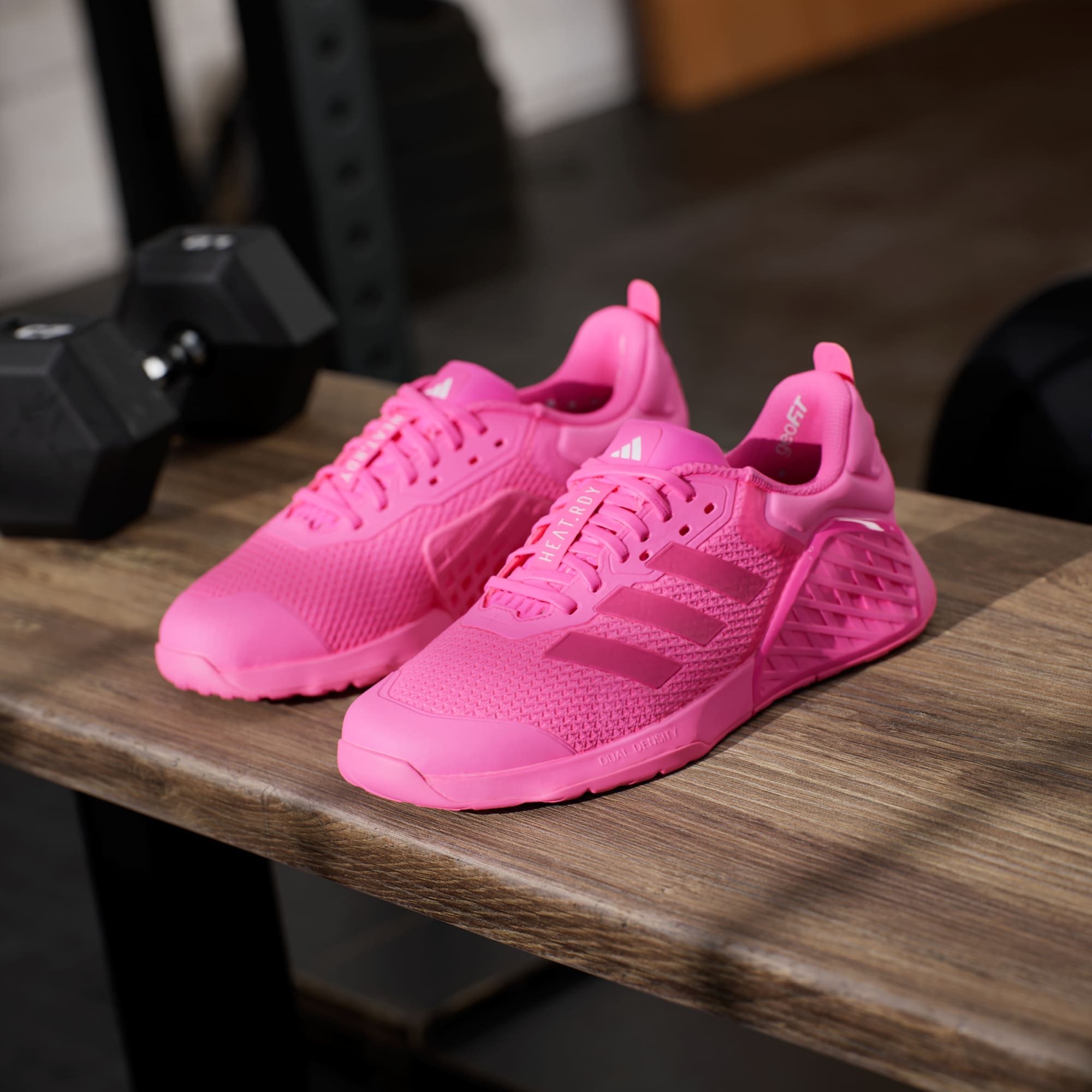 Whether the workout calls for power or endurance, these adidas shoes offer the support you need for strength training. A dual-density midsole keeps feet stable through heavy lifts, while remaining flexible enough for cardio. HEAT.RDY and a breathable upper work overtime to beat the heat, so you can focus on the reps. A wide fit accommodates swelling feet, and an Adiwear outsole grips the floor to drive performance. This product features at least 20% recycled materials. By reusing materials that have already been created, we help to reduce waste and our reliance on finite resources and reduce the footprint of the products we make.