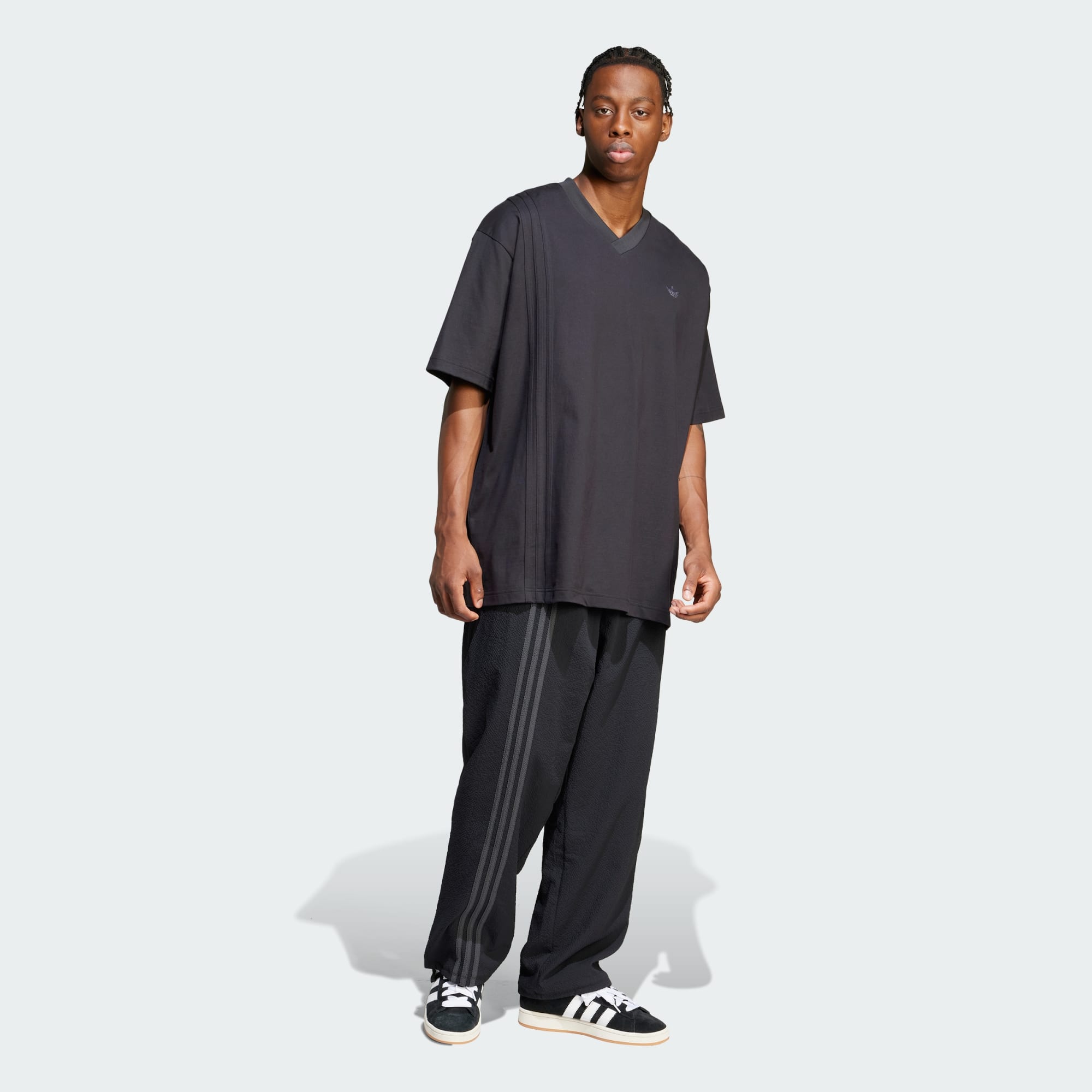An oversized V-neck tee with a unique 3-Stripes placement.