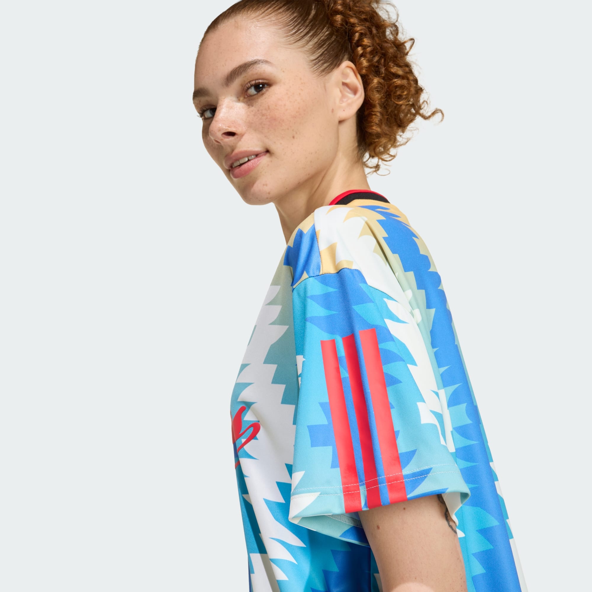 Football meets fashion with the House of Tiro x Common Goal Jersey Tee. Inspired by the vibrant football communities of Mexico, this jersey t-shirt embodies the spirit of unity and pride. It features a striking all-over print inspired by Mexico's rich football heritage. The loose fit and ribbed collar give it a relaxed look, making it a fantastic choice for both on and off the pitch. The 3 Bar Logo on the chest and classic 3-Stripes on the sleeves add a touch of adidas heritage too. Join us in celebrating the universal power of football and the freedom it brings. With this jersey t-shirt, you're not just wearing a piece of clothing. You're wearing a story of tradition, innovation, and community.