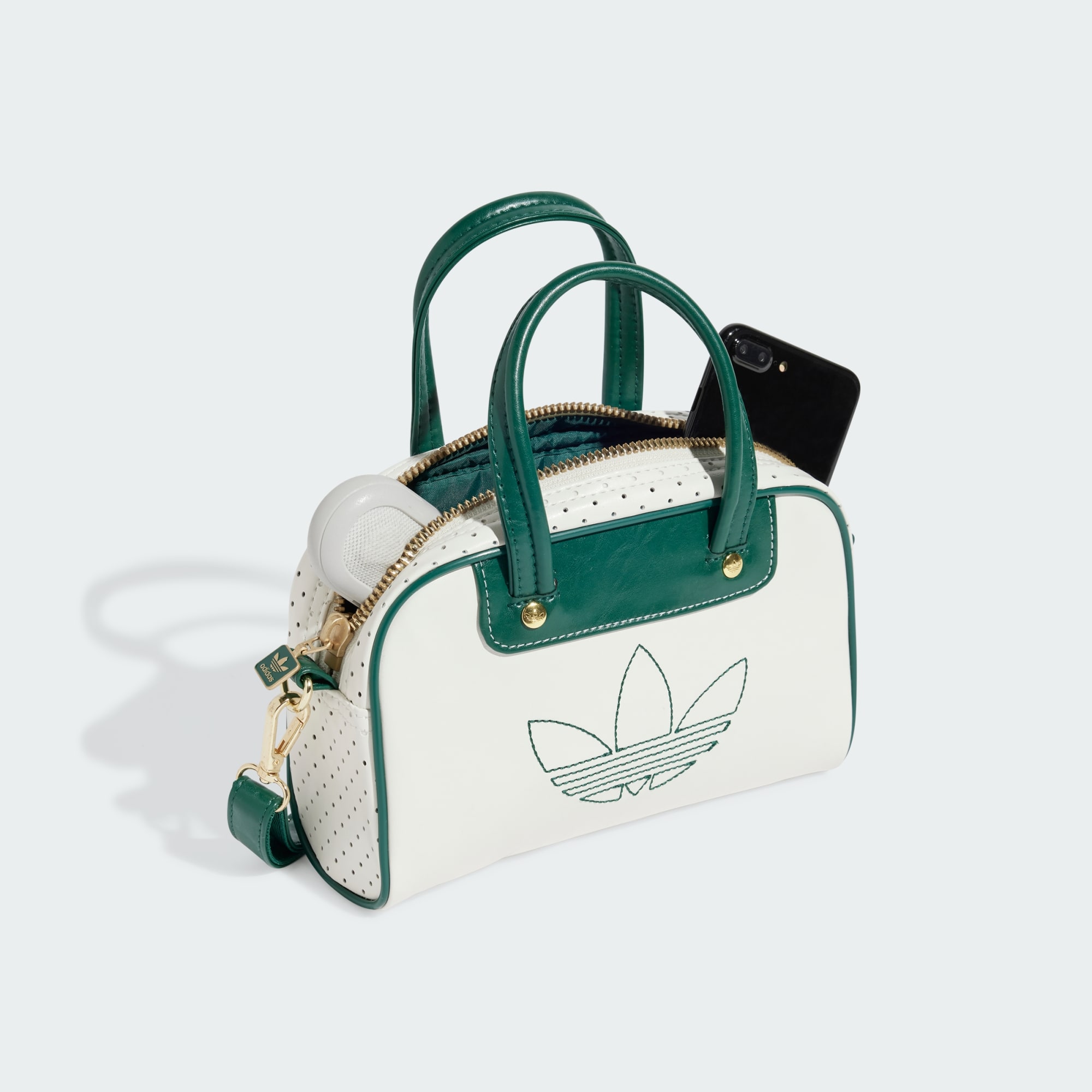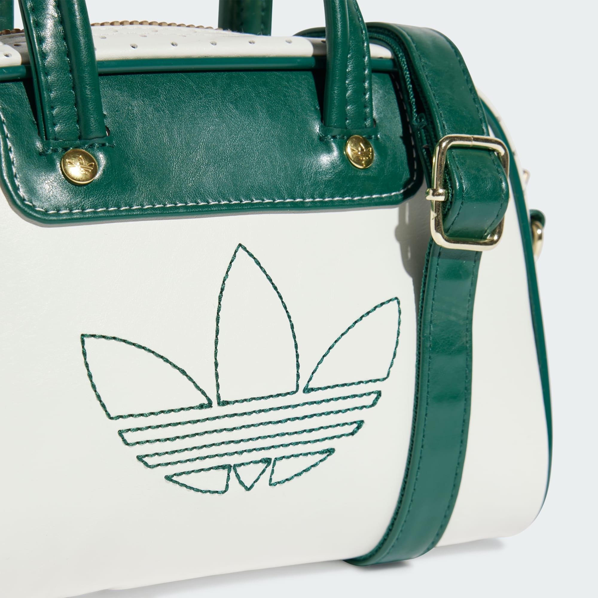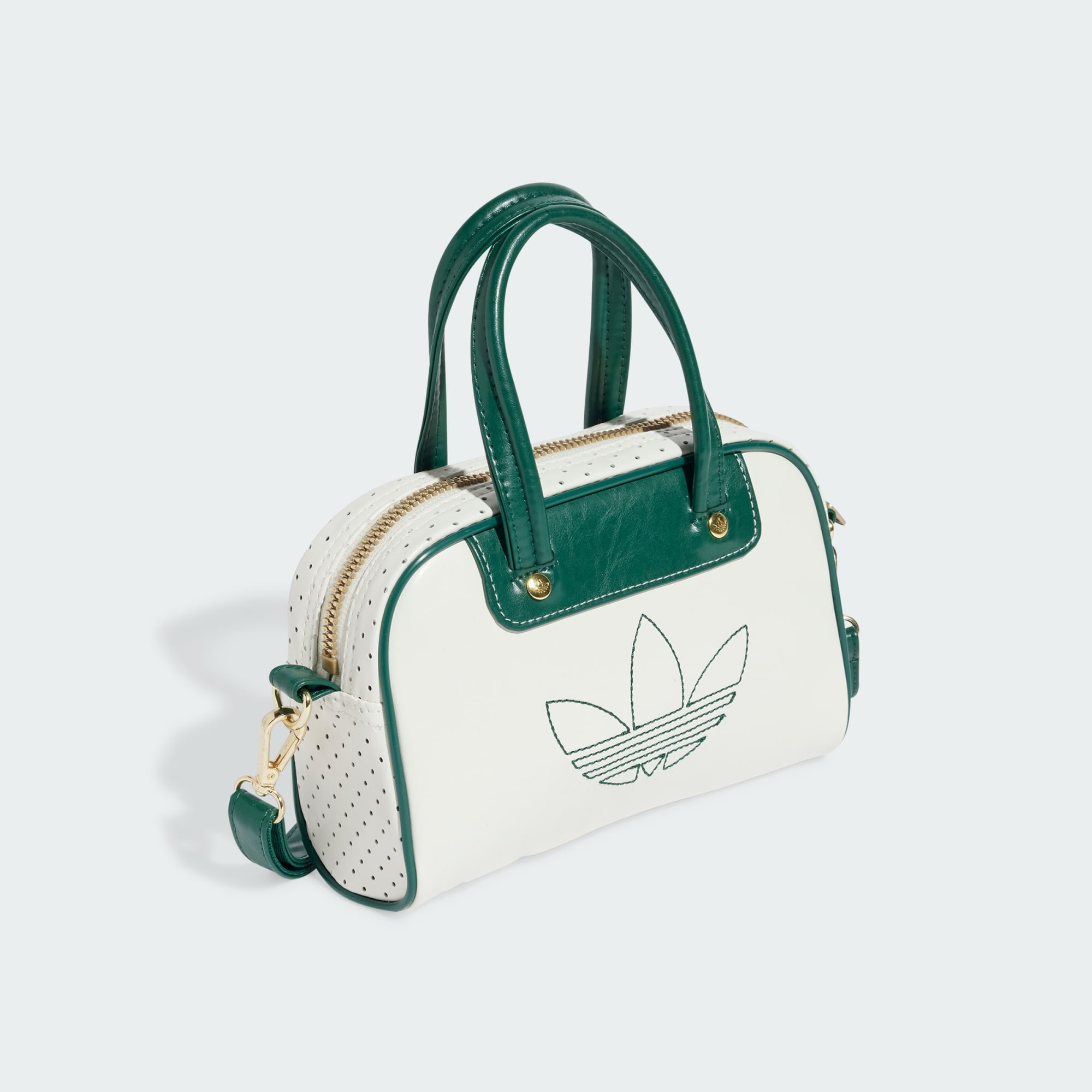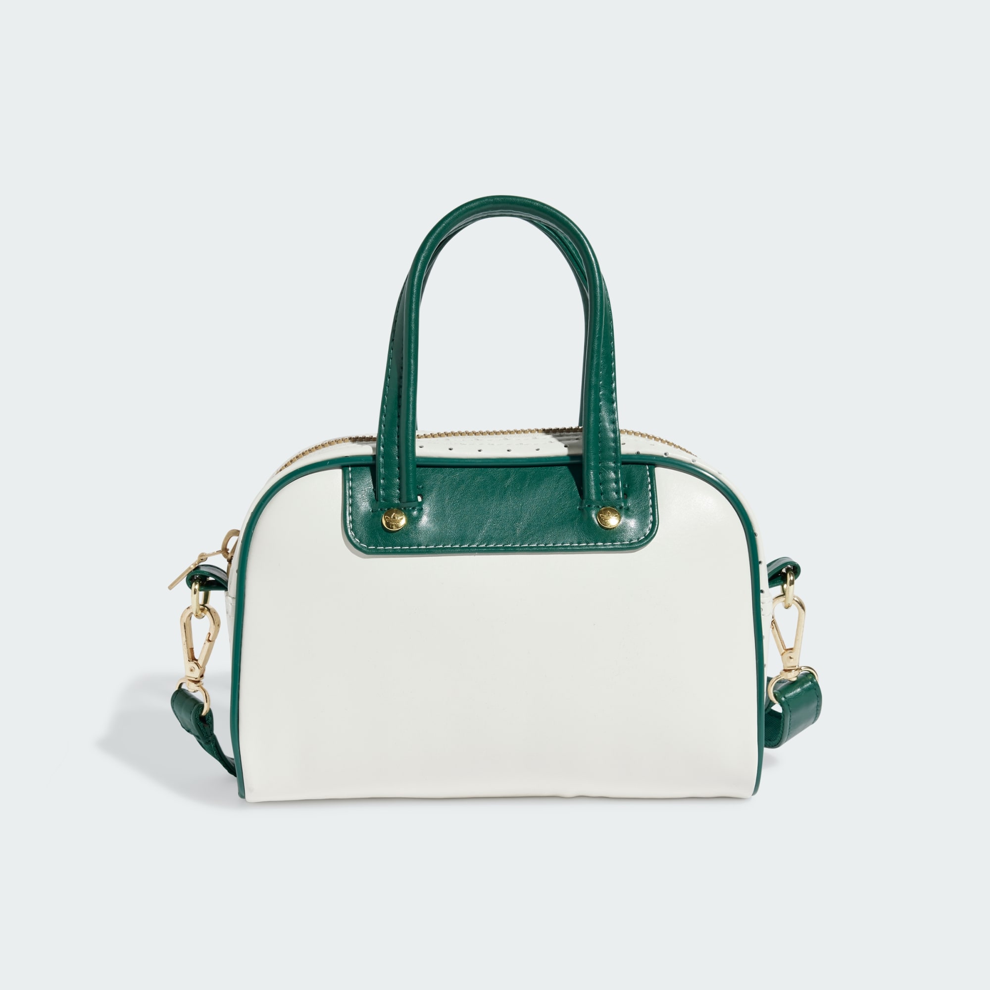 Inspired by iconic adidas trainers, this mini bowling bag is a heritage silhouette with modern style. Perforated and crinkled faux leather pairs up with contrast-colour piping for a look that's all about casual cool. With a detachable shoulder strap, this bag is as versatile as it is fashionable. An embroidered Trefoil and metallic-gold hardware provide the finishing touches.