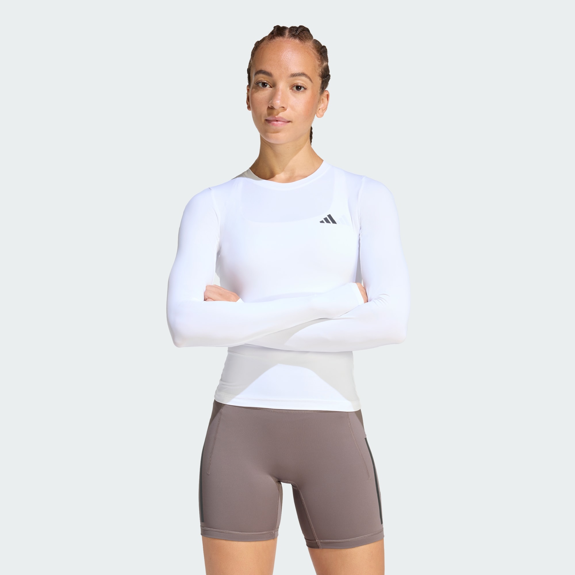 Commit to your workout with the PrimeLift Essentials Workout Contour Long Sleeve top. Designed for those who embrace the gym as their sanctuary, this long sleeve top is all about confidence and performance. Its sleek, tight fit contours to your body, offering a flattering silhouette that moves with you. It’s crafted from single jersey fabric that provides a soft touch against your skin, and there are thumbholes that help sleeves stay in place during intense sessions. Manage sweat with Climacool technology. Materials wick and manage sweat quickly. This helps keep you focused on your performance. The UV-protective textile makes the top suitable for outdoor training too. Whether you're layering for style or function, this adidas top adapts to your needs, empowering you to express your personal fashion sense while achieving your fitness goals. Designed for hybrid training and versatile performance.