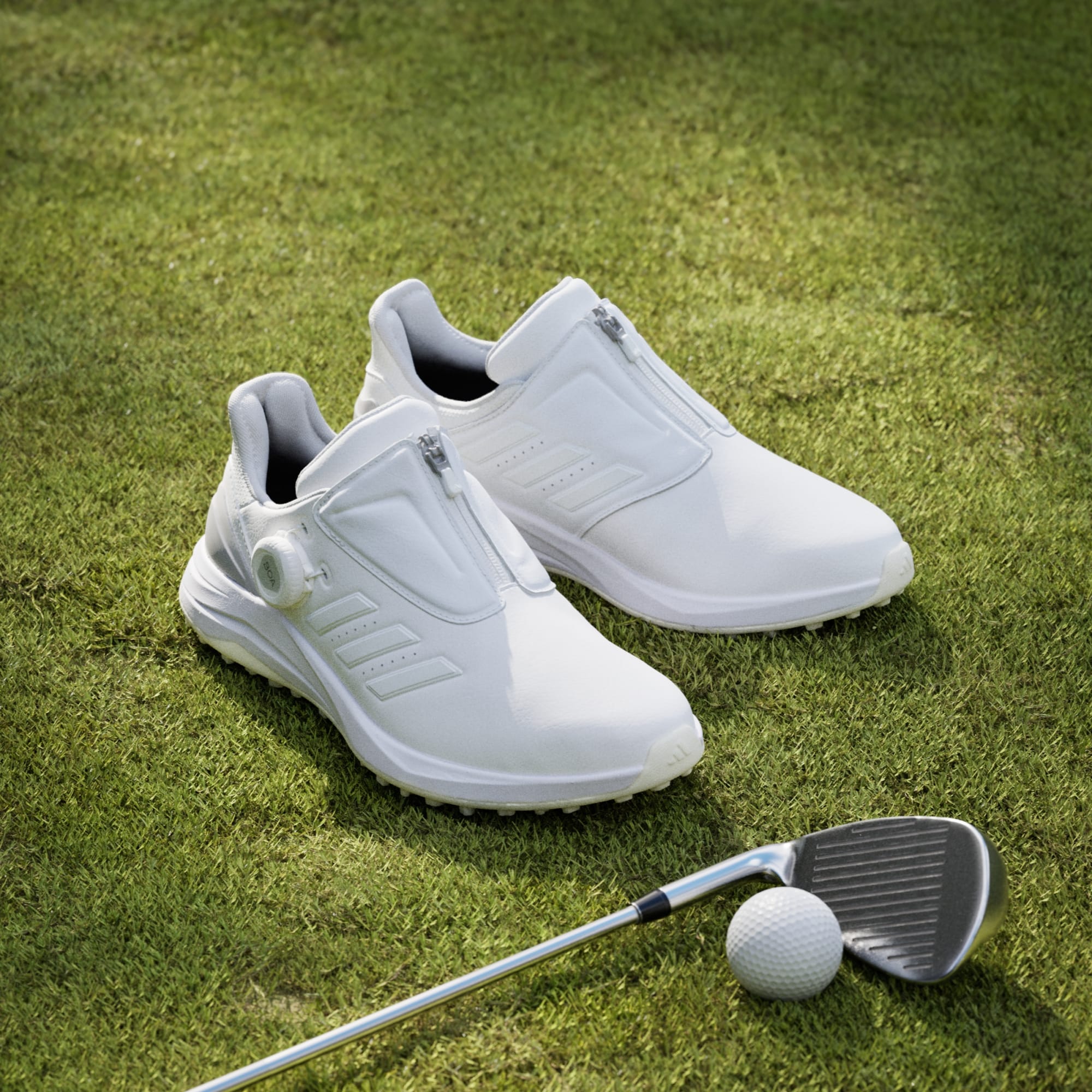 Dial in comfort from the very first wear in these adidas Solarmotion spikeless golf shoes. Providing excellent traction, flexibility and stability from the first drive to the final putt, they feature a quick, easy BOA® fit system that lets you achieve a custom fit with one hand. Lightweight LIGHTSTRIKE foam cushions and supports every step, while the rugged Adiwear outsole grips the turf and anchors your swing. The moulded foam collar locks in comfort around your ankle, and the waterproof upper fends off moisture from wet grass.