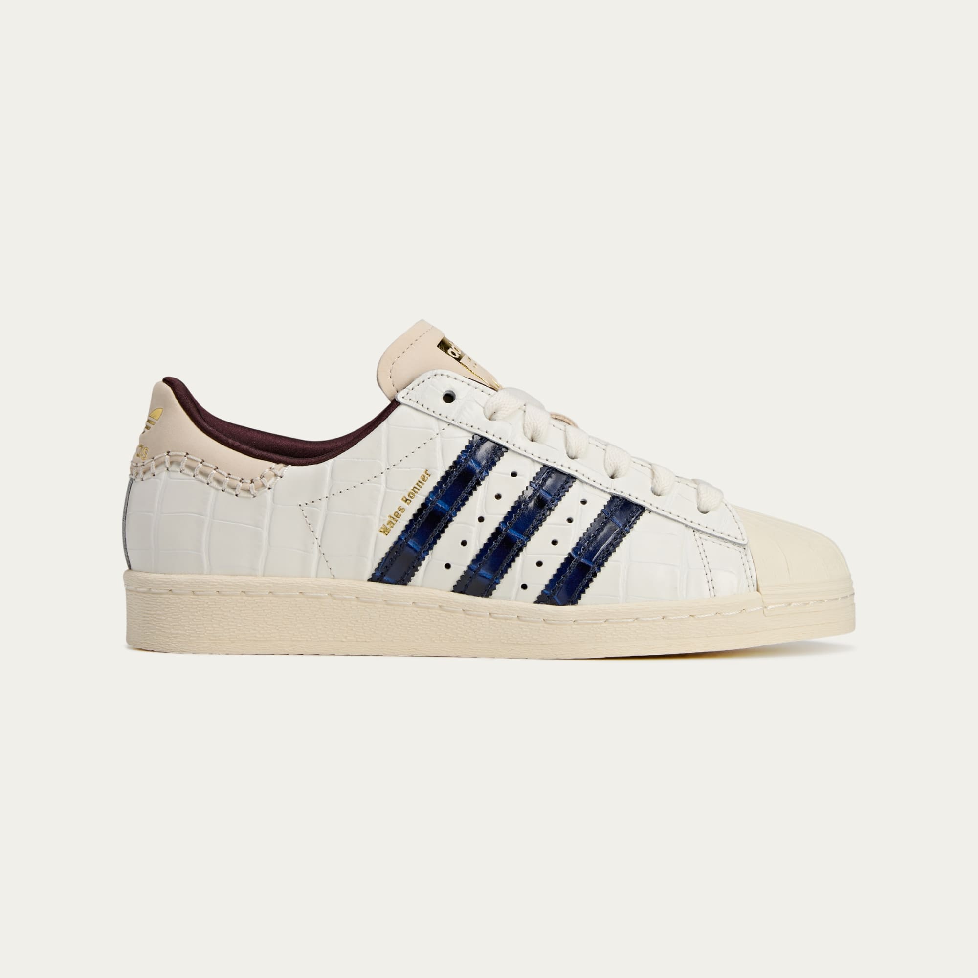 The Fall/Winter 2024 collection from adidas and Wales Bonner merges tradition with modernity in a celebration of hip hop movement and romanticism. Music and creative vibrancy are threaded into the collection through the textures, shapes and colours across the pieces. A refined version of an unmistakable adidas silhouette, the Wales Bonner Superstar Shoes replace the expected smooth leather upper with a croc-textured embossed cow leather material on both the upper and 3-Stripes. Premium nubuck forms the tongue and heel moustache, and the aglets are done in golden metal. One shoe finds Wales Bonner gold foil branding, and adidas Superstar branding on the other.