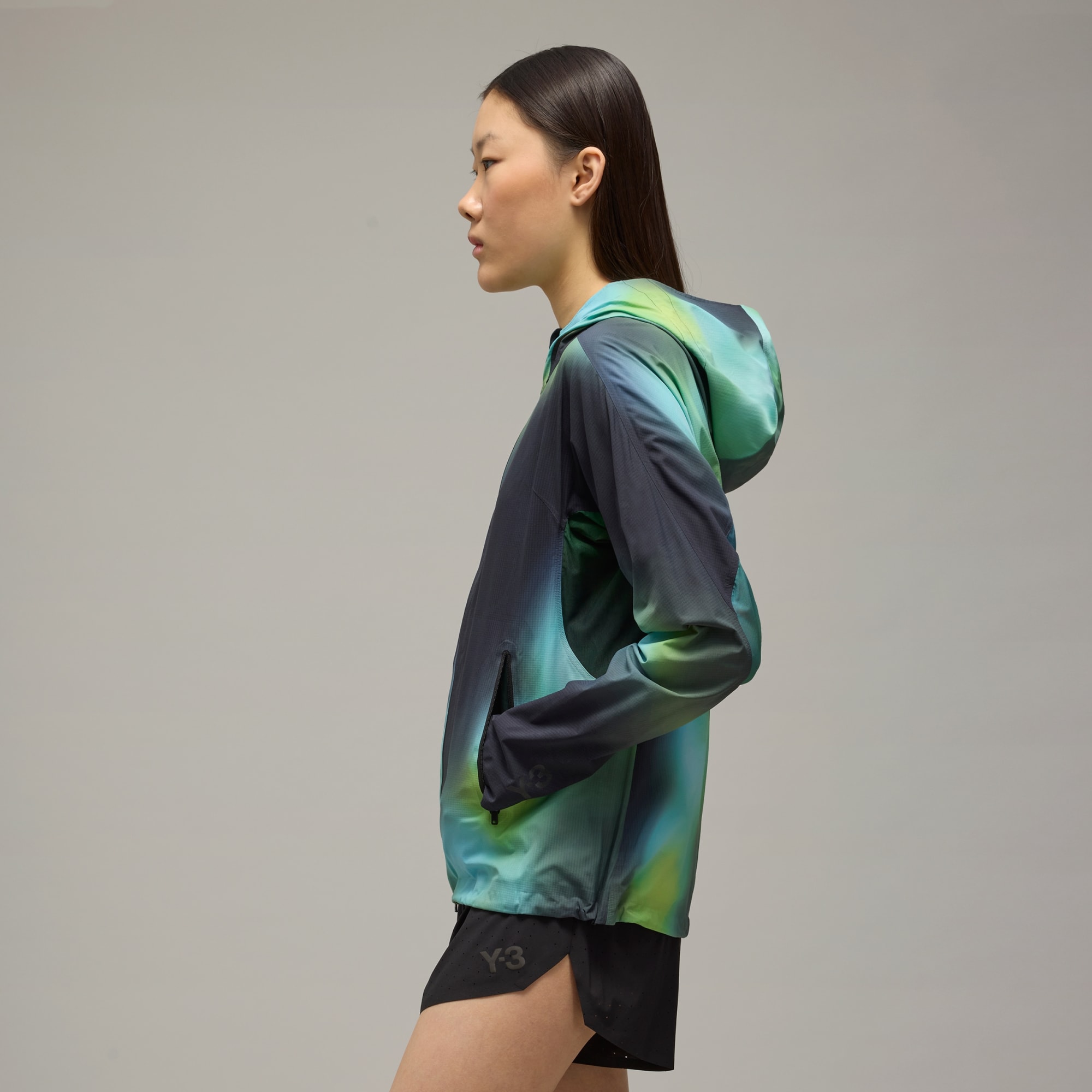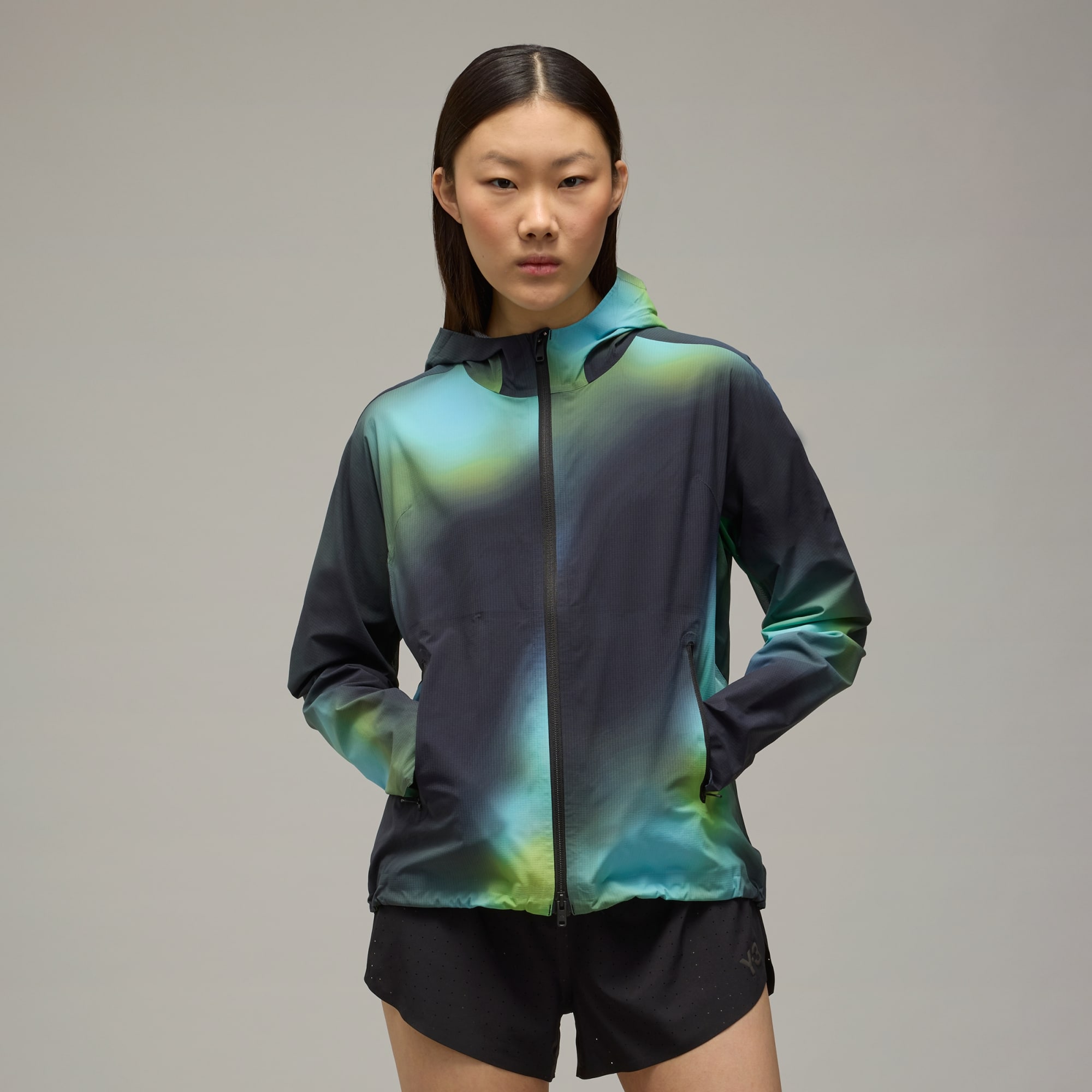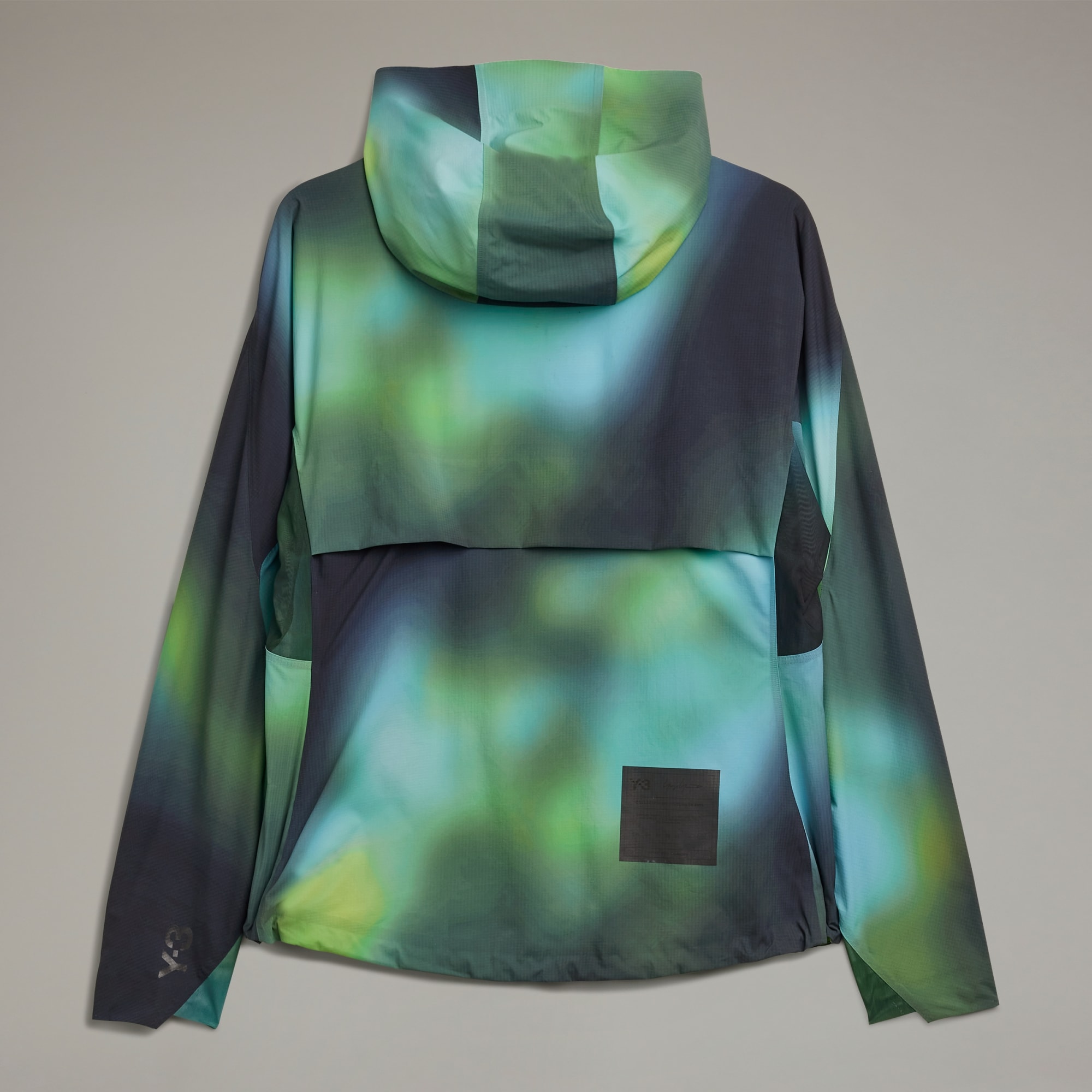 A performance running jacket from Y-3 with a blurred allover print.
