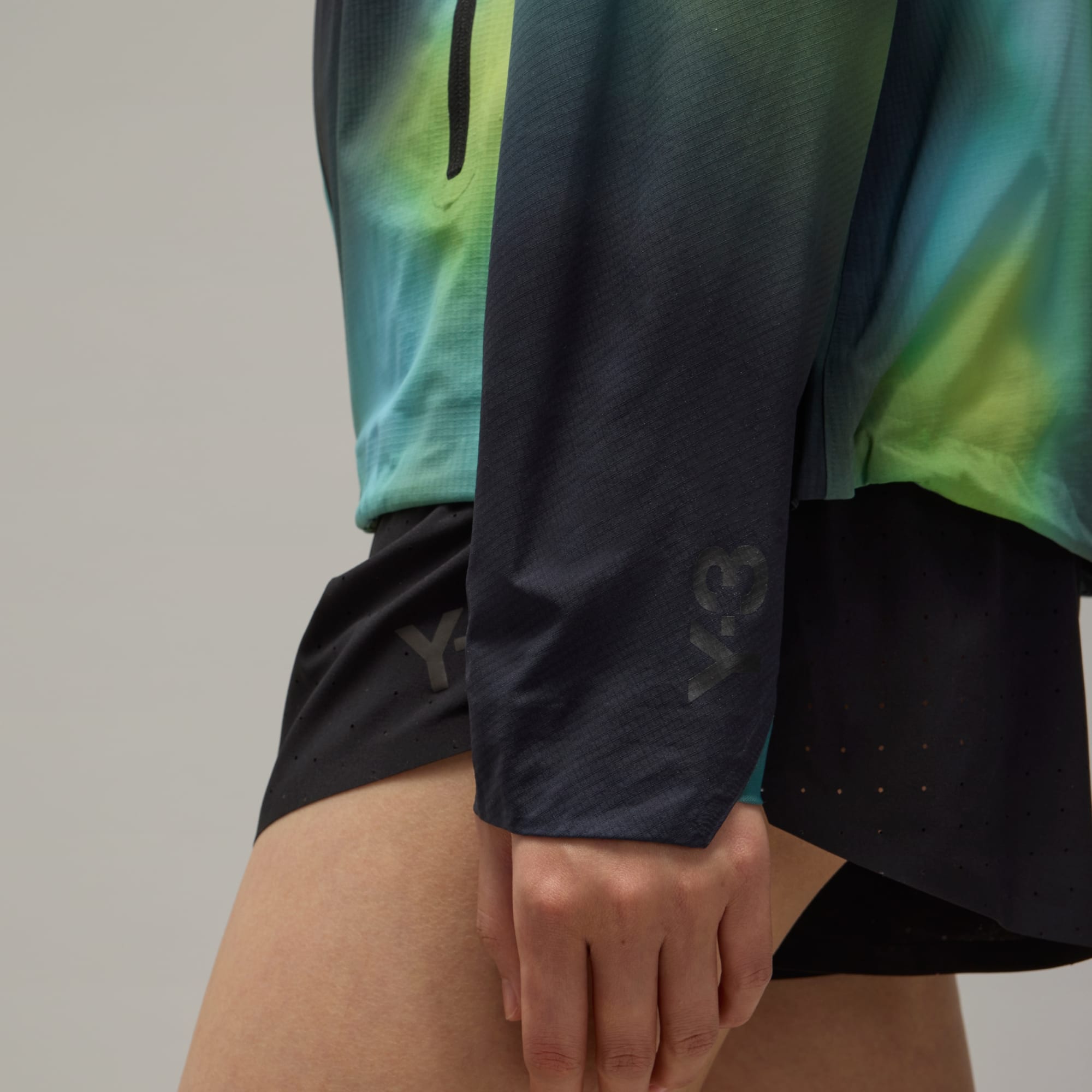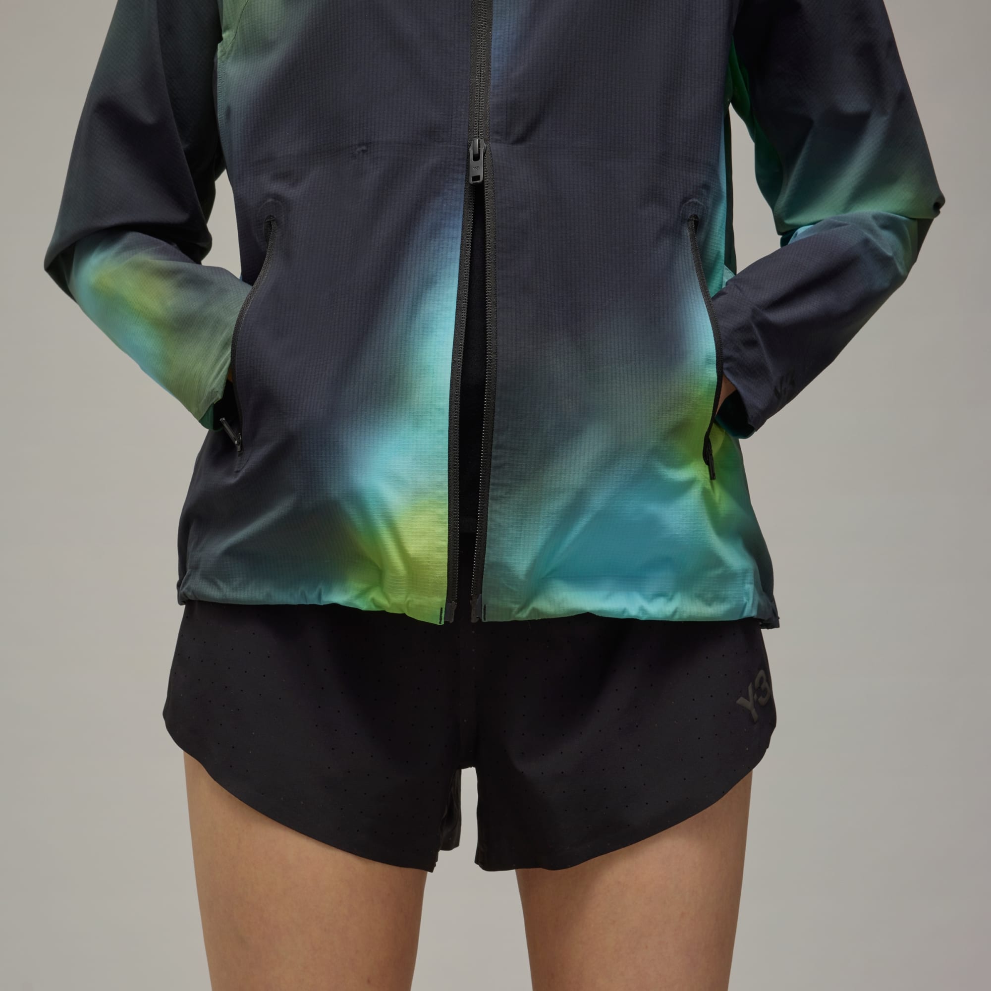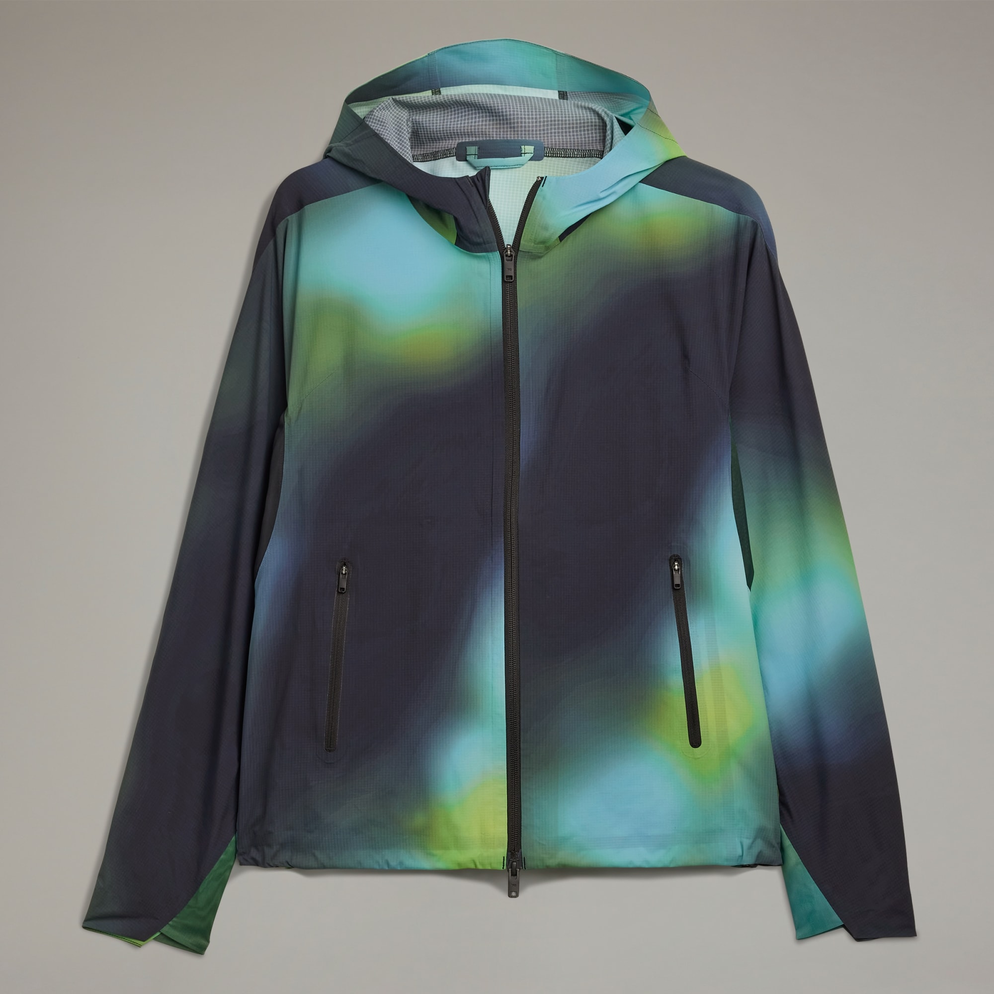 A performance running jacket from Y-3 with a blurred allover print.