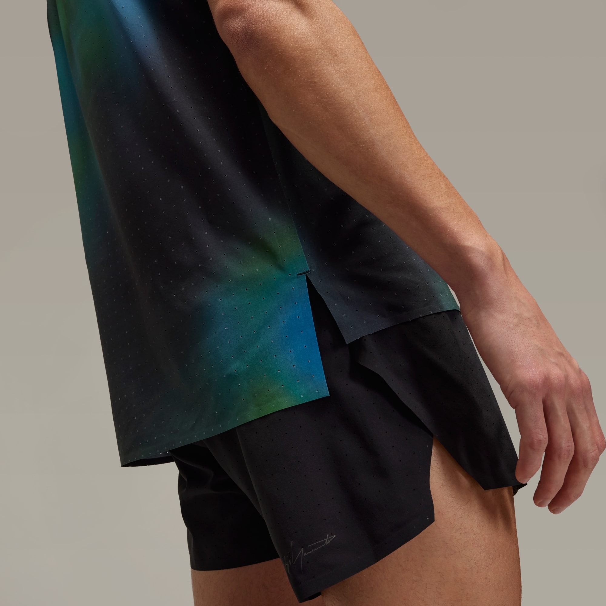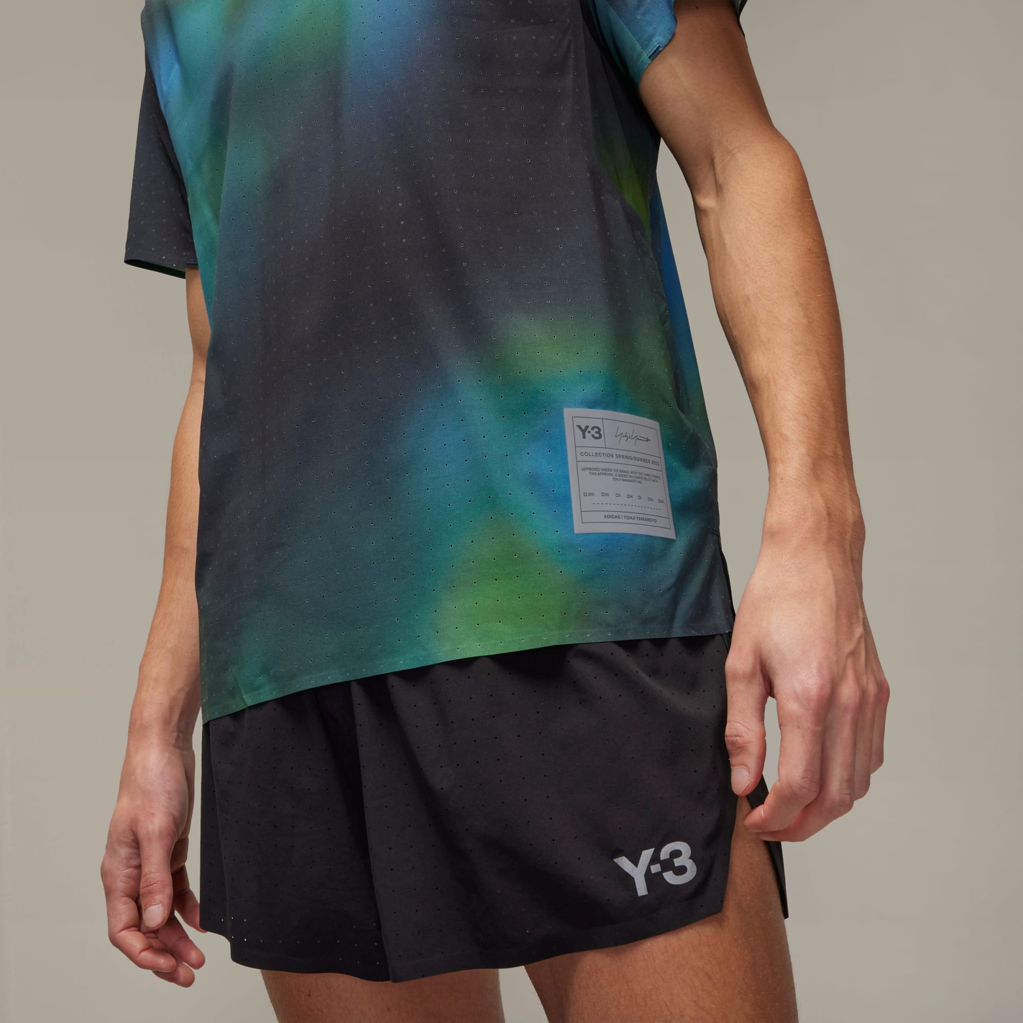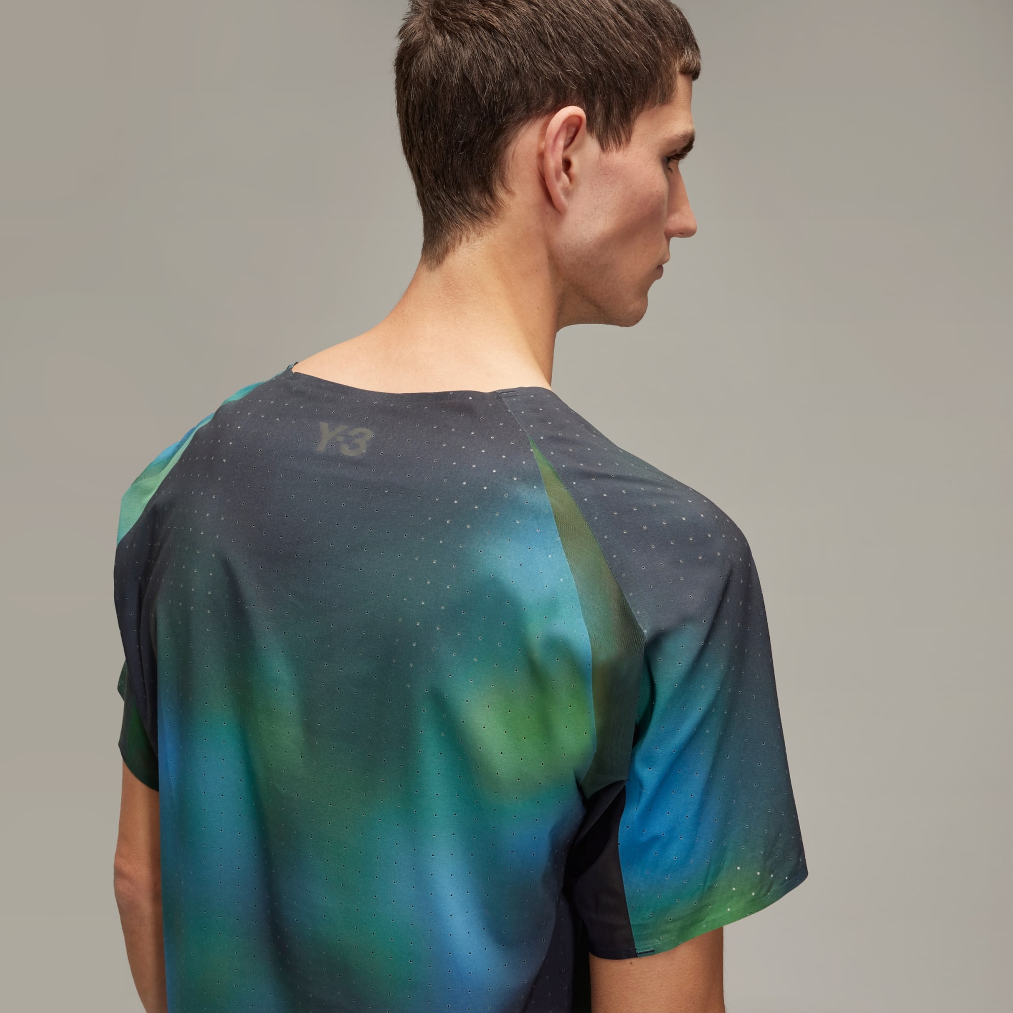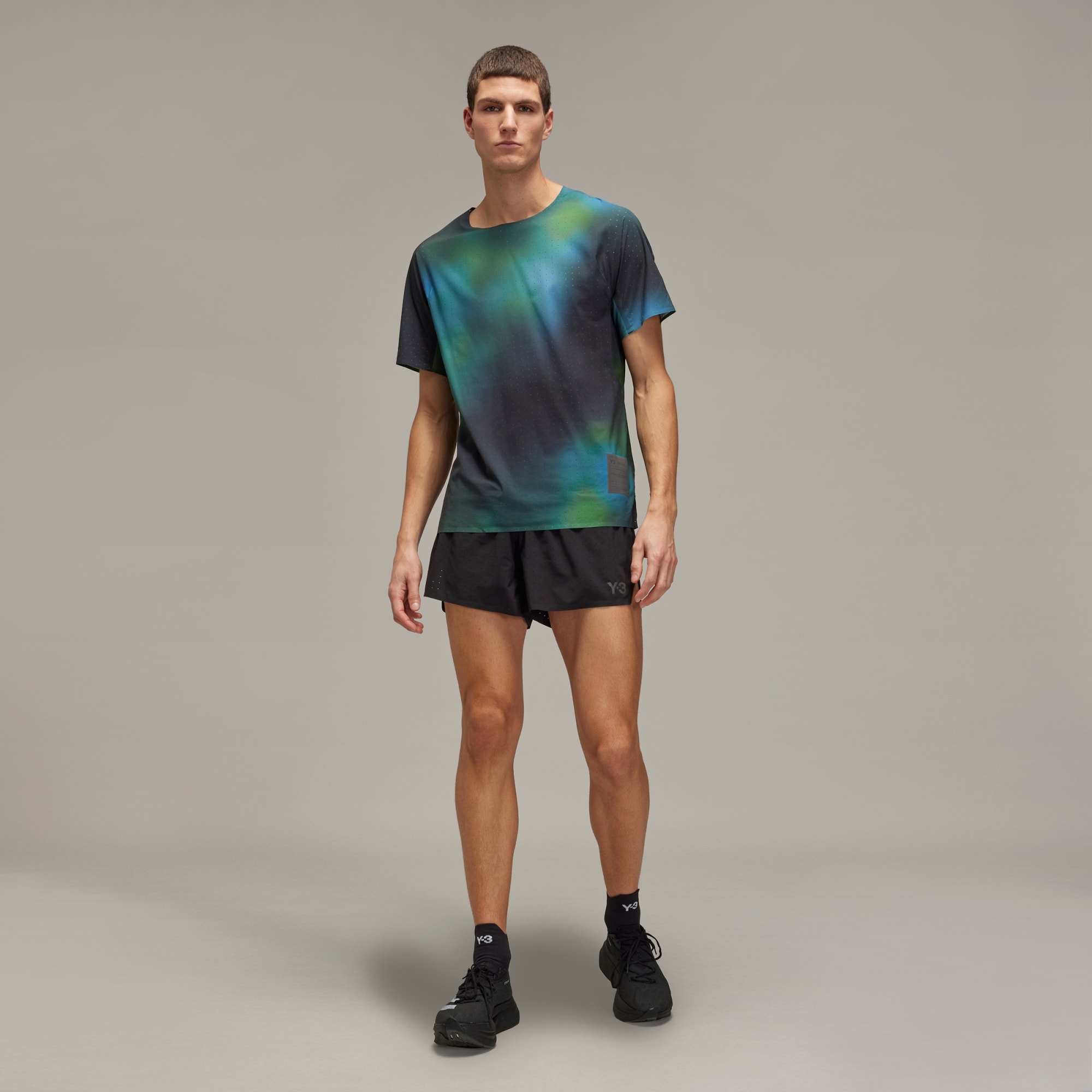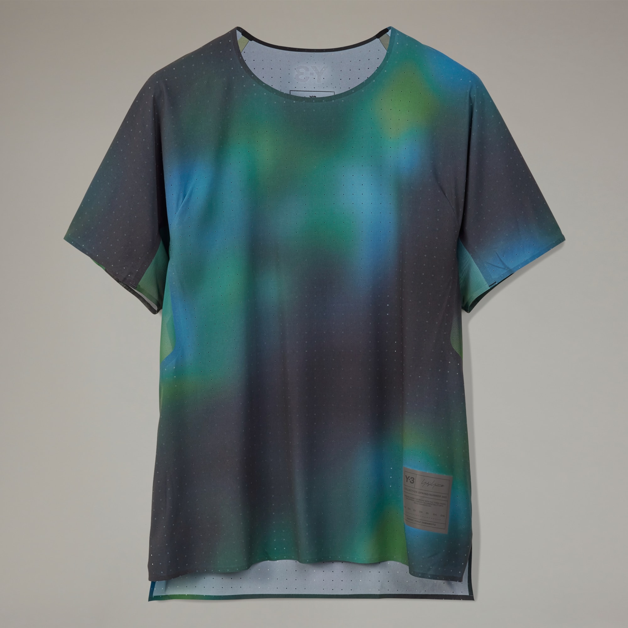 A performance running tee from Y-3 with a blurred allover print.