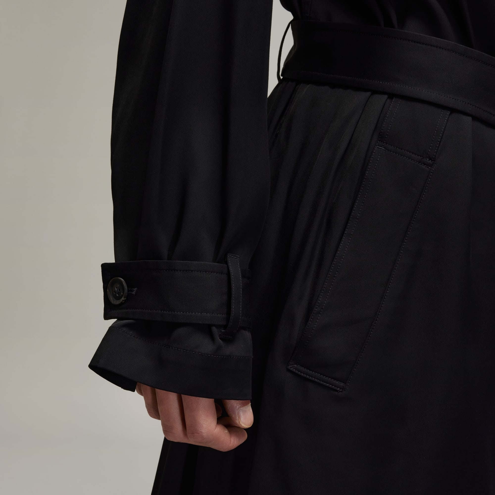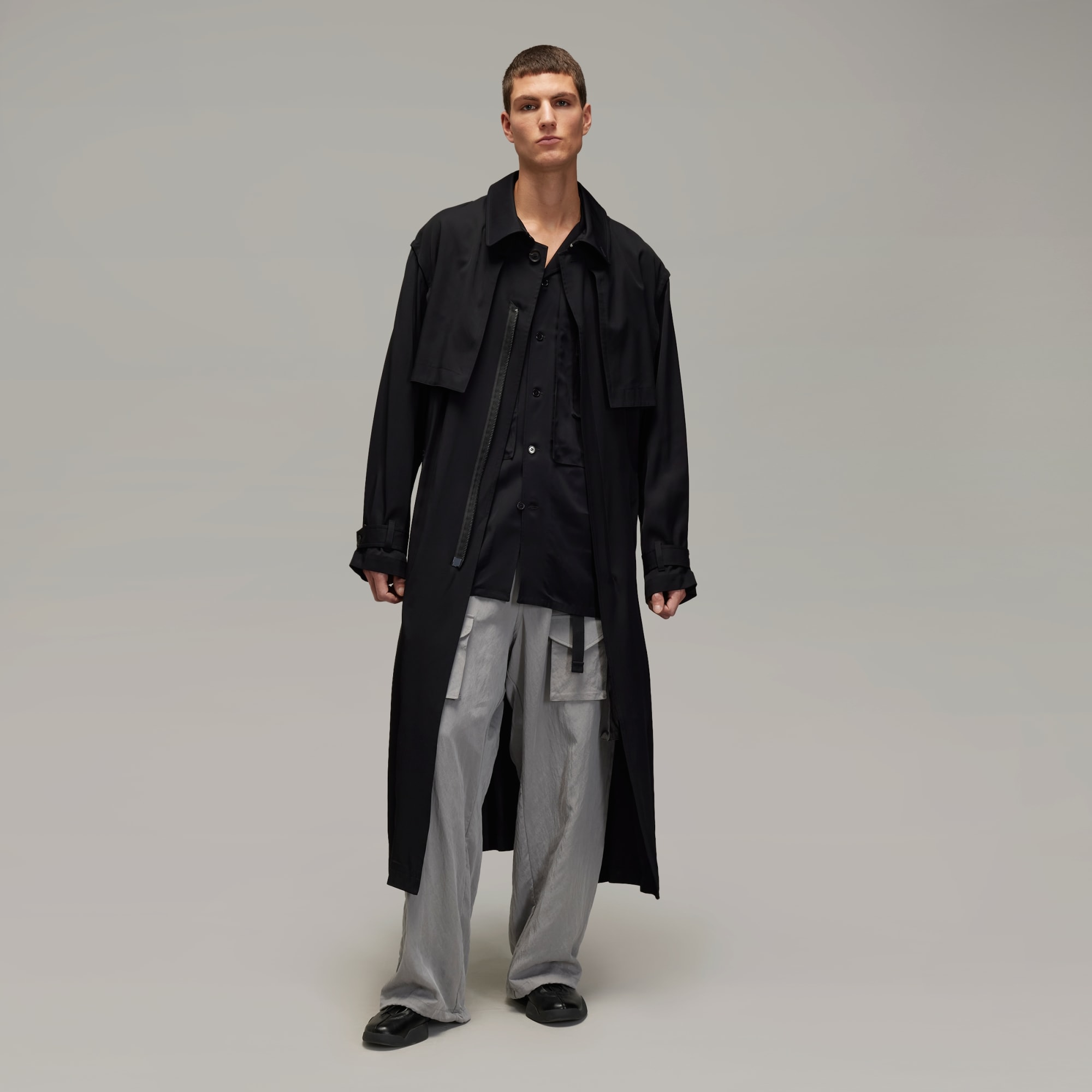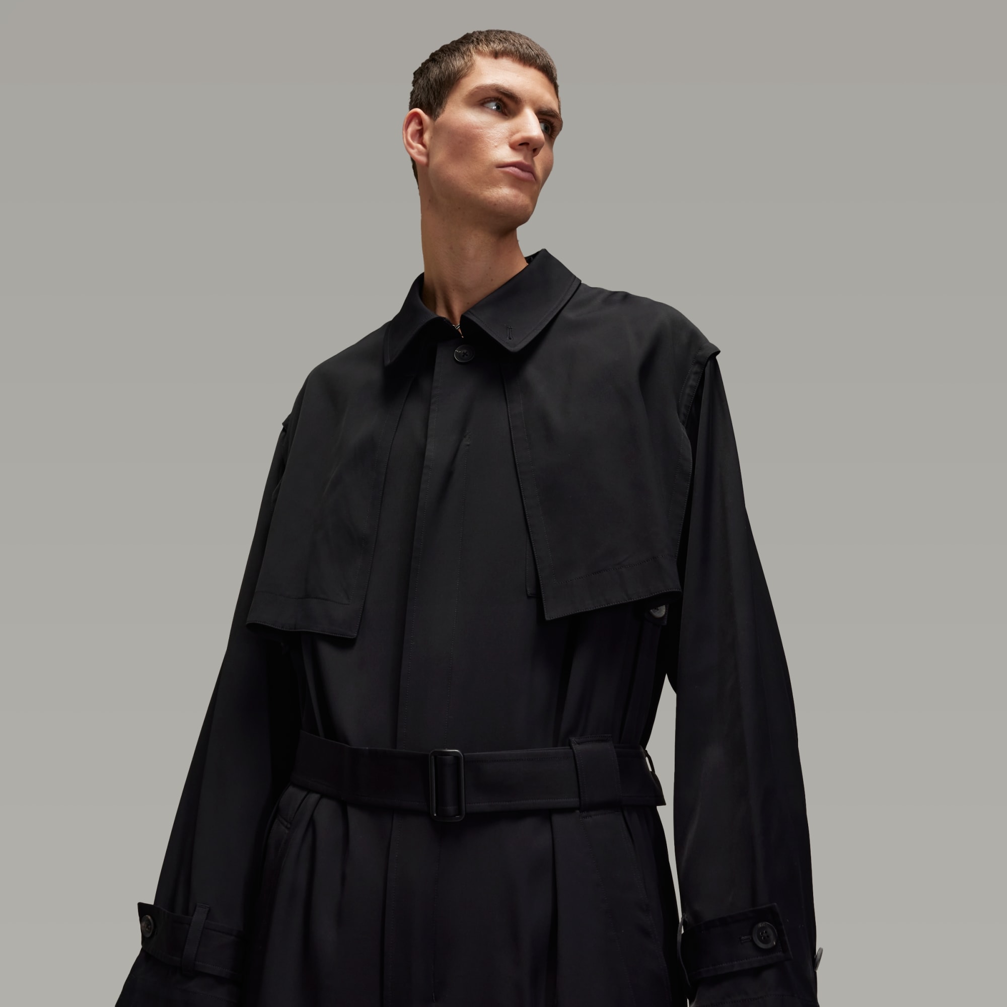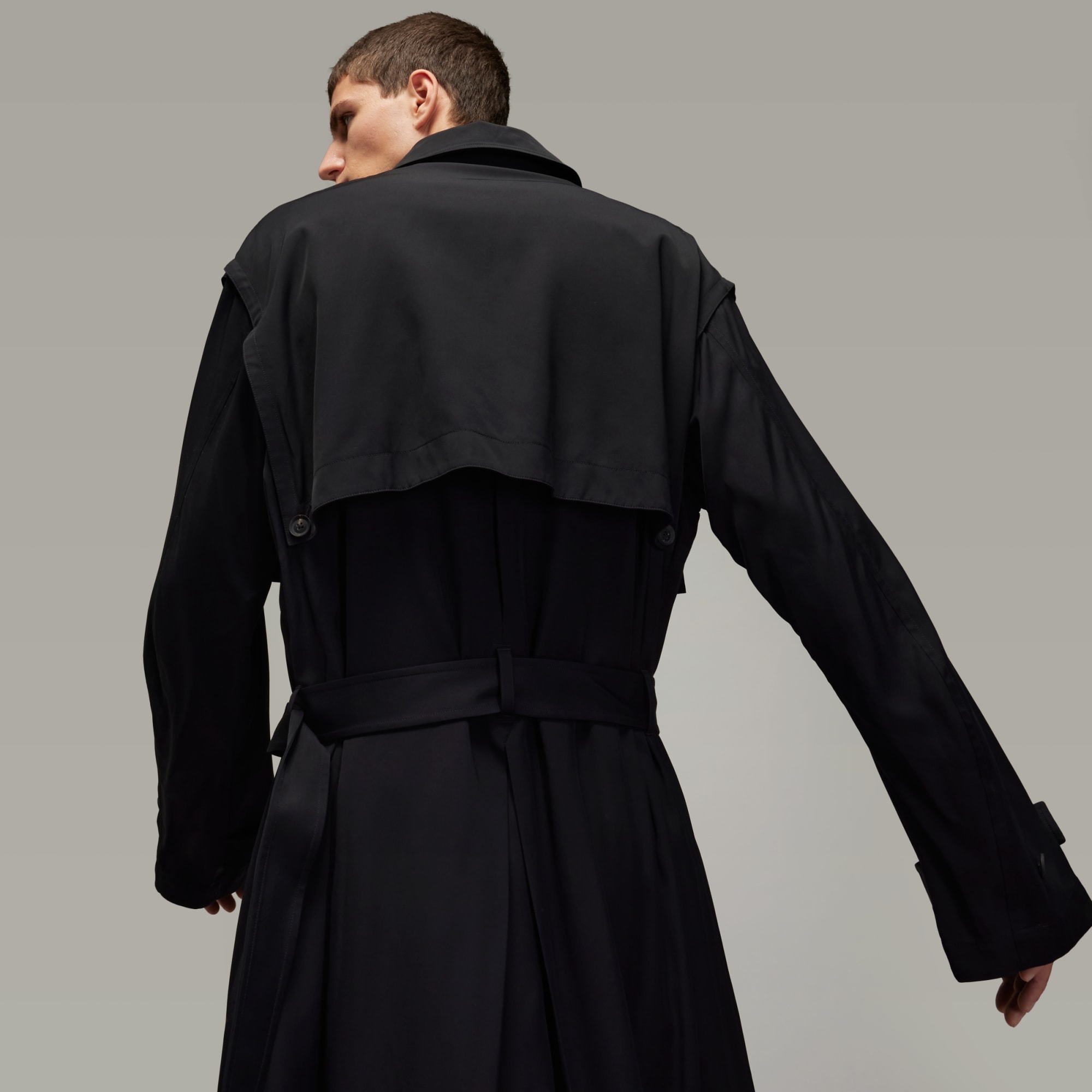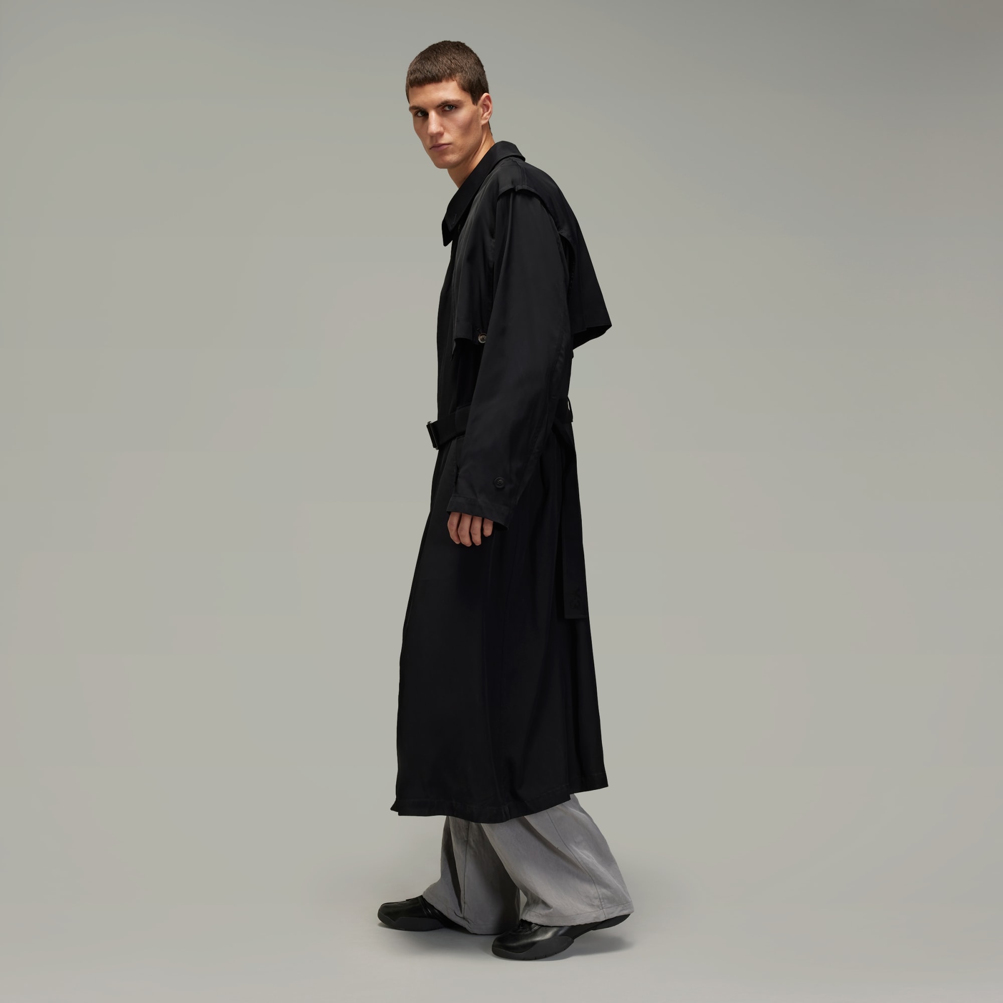 The Y-3 Rayon Twill Coat is an elevated take on the classic loose-fitting trench coat. The rayon twill fabric is cut for an elegant drape with a wider silhouette and flaps at the front chest and the back of the upper body. A belt secures the lower waist. A satin Y-3 logo completes the iconic style.
