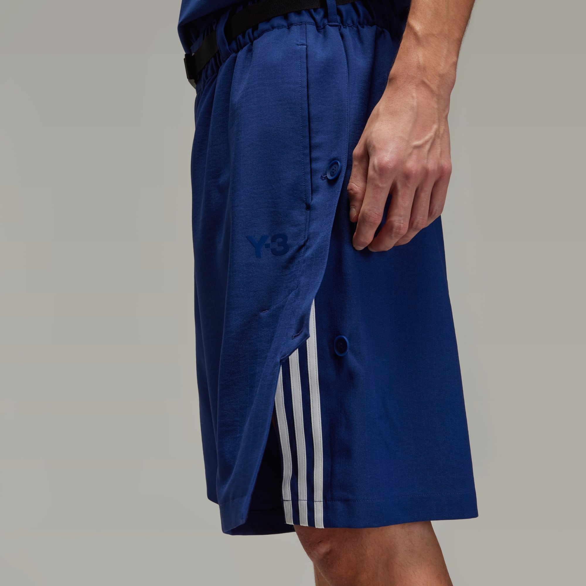 The Y-3 Sport Uniform 3-Stripes Shorts reinterpret adidas heritage through a fashion-forward Y-3 lens. They're built in durable twill with a nod to utilitarianism through the flap pockets, D-ring and integrated belt. A partially detachable front layer can be unbuttoned to reveal matte satin 3-Stripes underneath.
