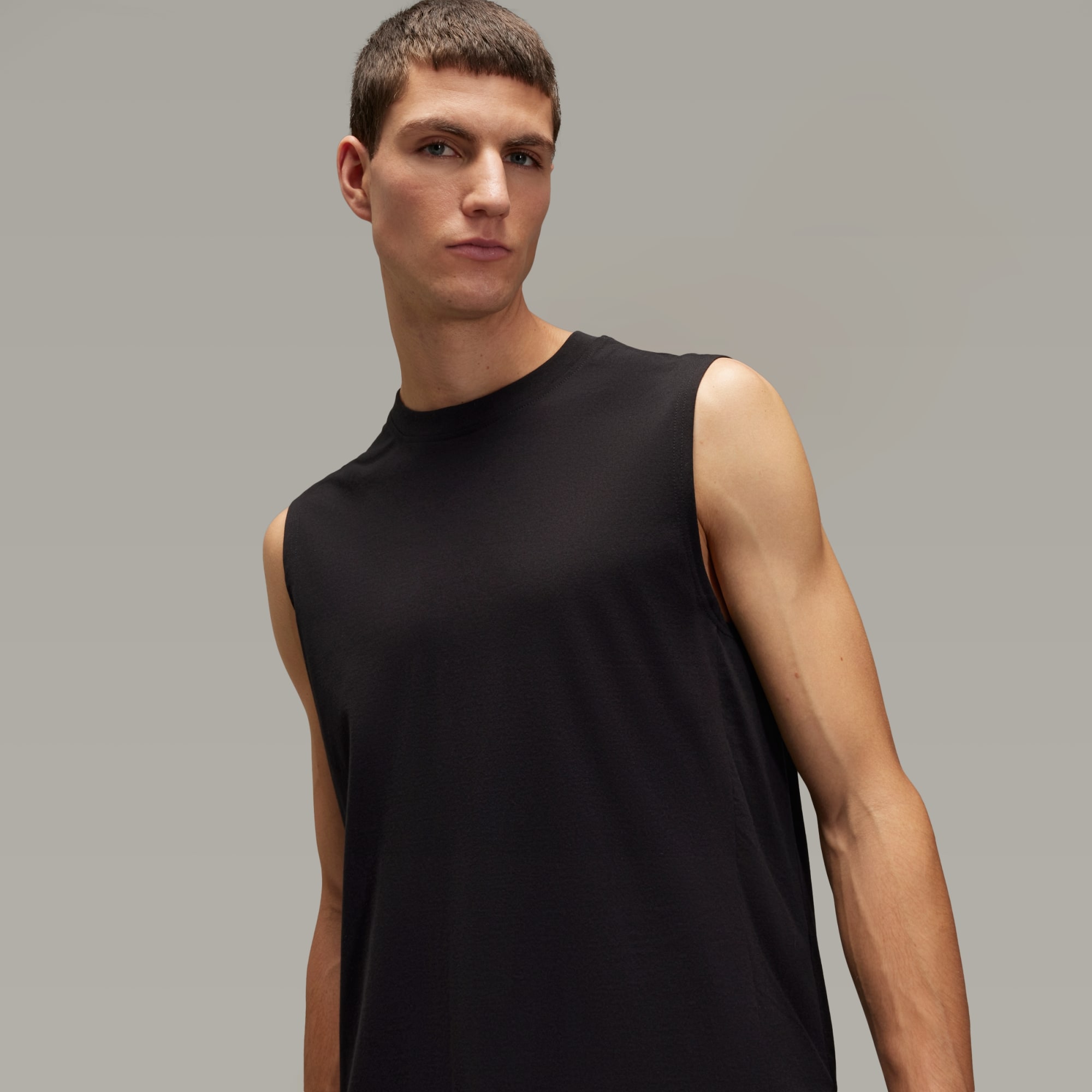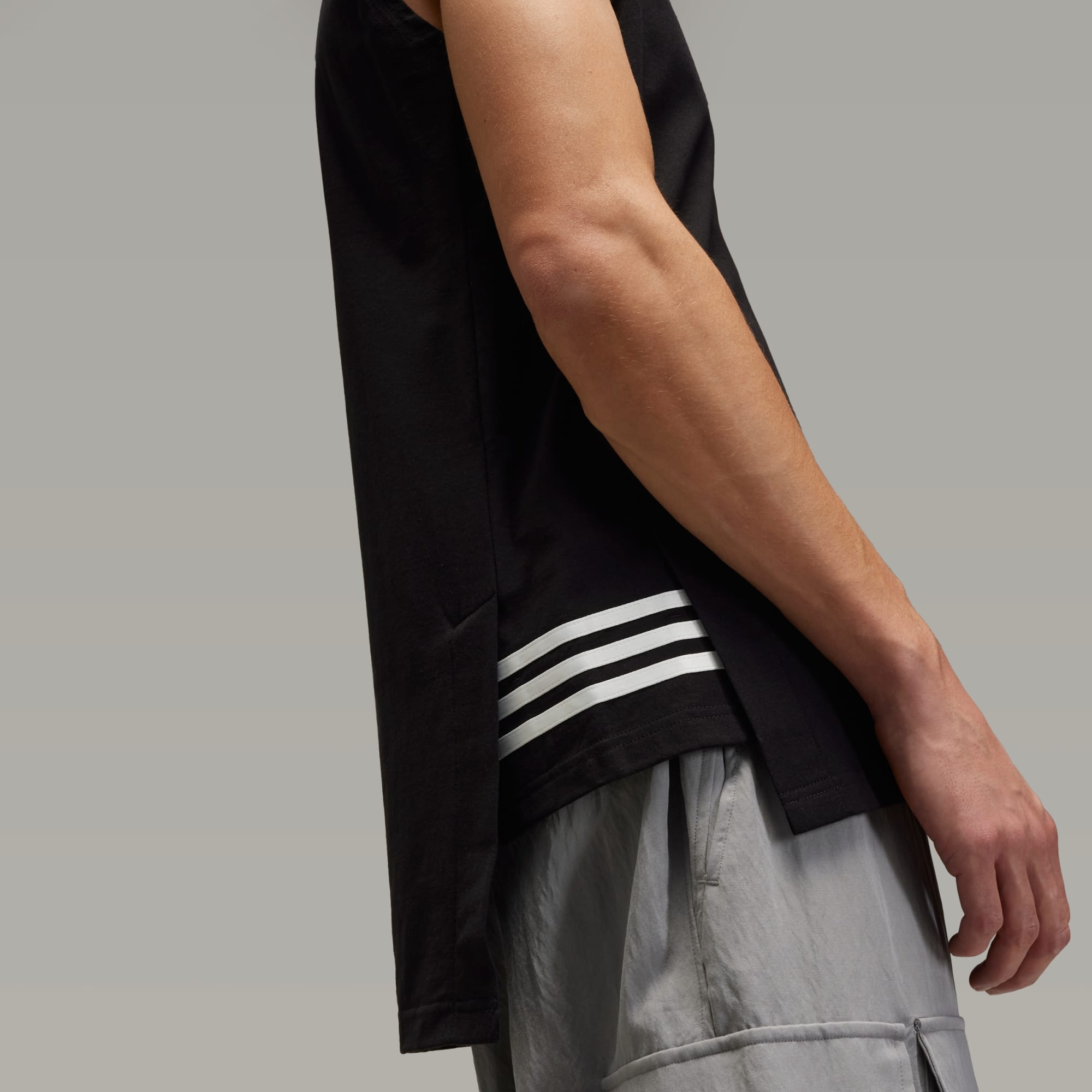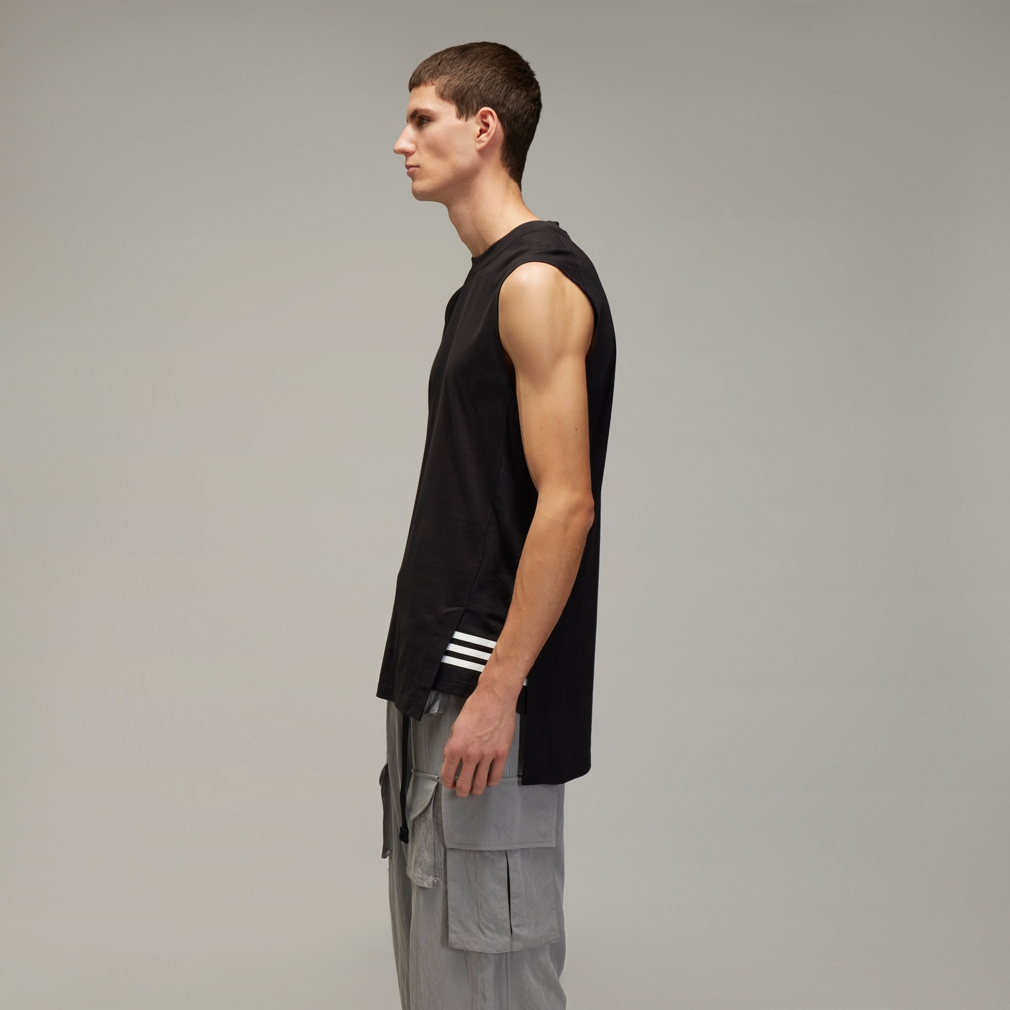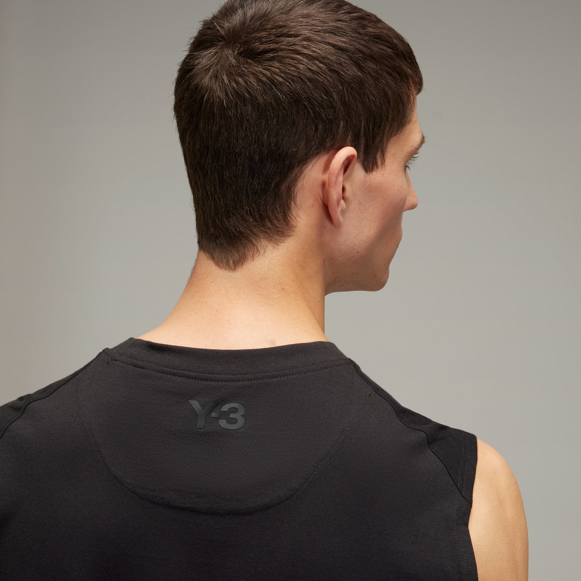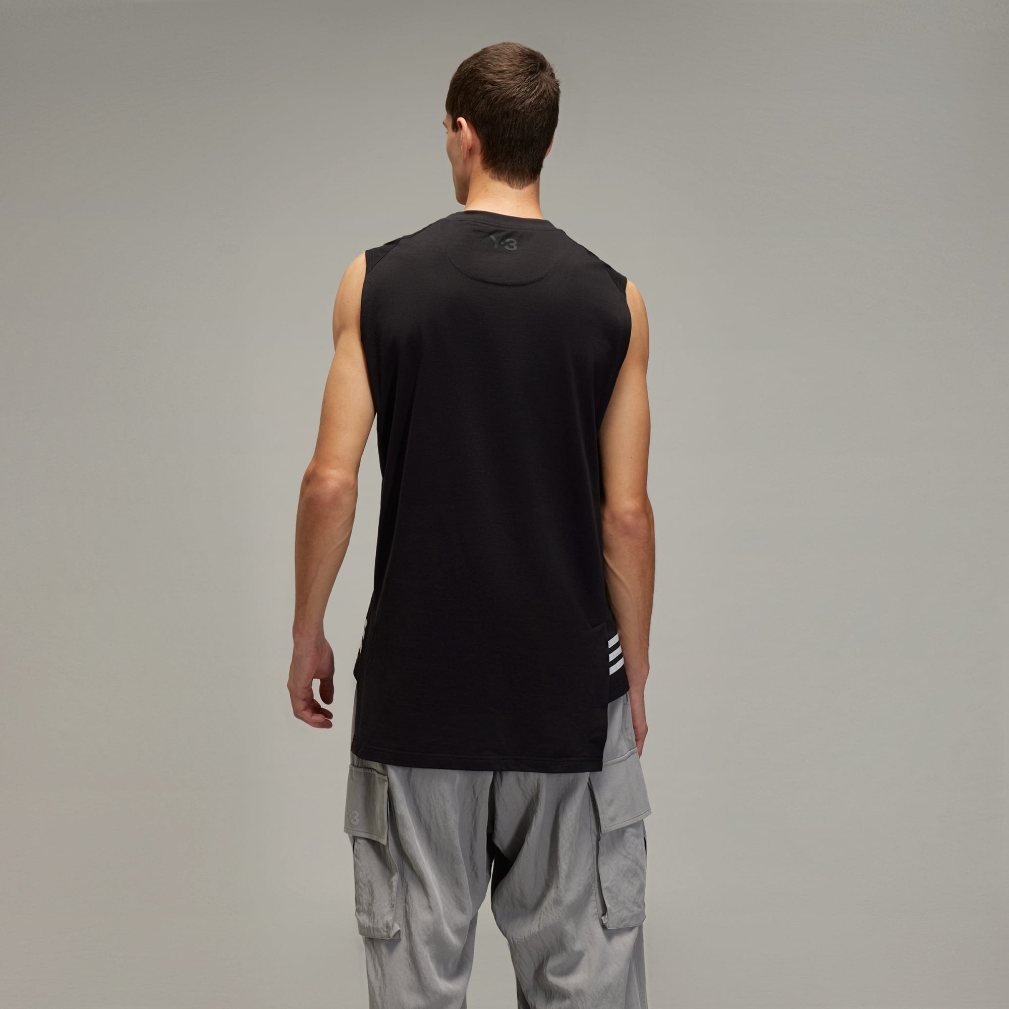 The Y-3 Tank Top is a subtle visual experimentation with how we see lines. The longer back, shorter front and horizontal 3-Stripes on the sides create layers, giving illusion to form. It's crafted from soft cotton knit material and finds a contrast Y-3 logo beneath the ribbed collar on the back.