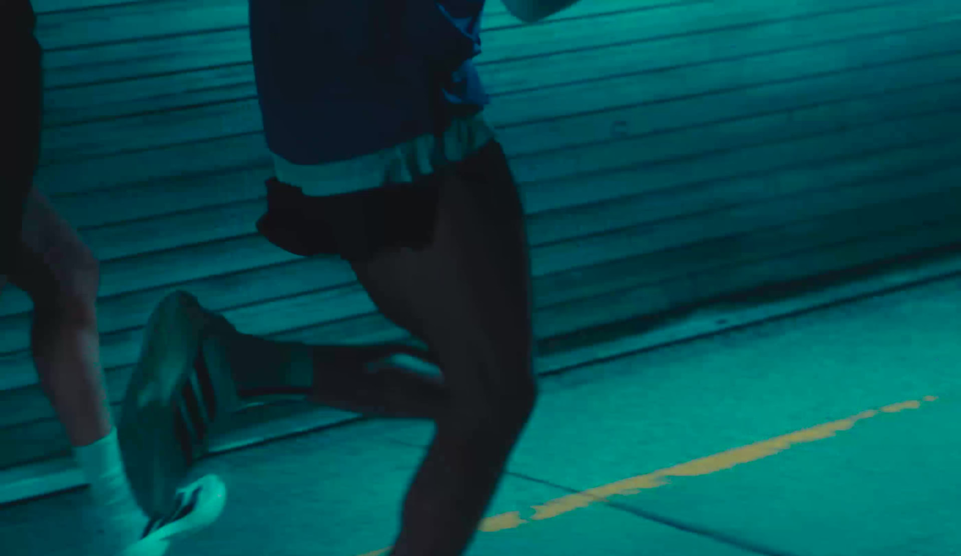 The image depicts a person's lower body wearing athletic shoes and clothing in a dimly lit, dramatic setting.