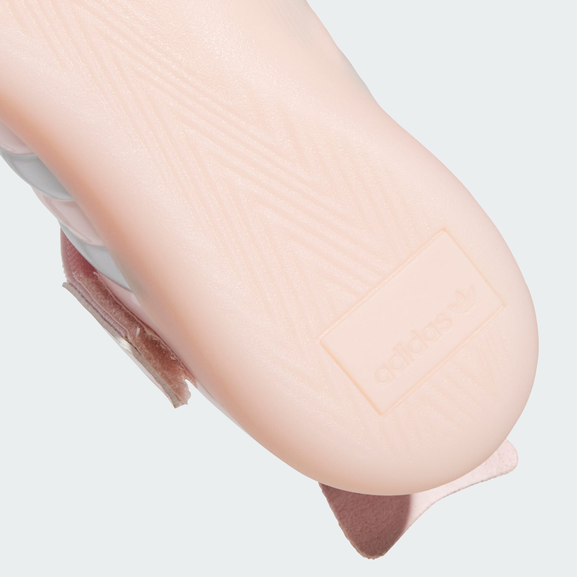 ผู้หญิงคนหนึ่งนั่งอยู่บนพื้นไม้ห่อด้วยผ้าห่มสีชมพูนุ่มฟู เธอสวมรองเท้าเทควันโด CLOT สีชมพูอ่อนจากอาดิดาส แต่งแถบสีเงินเมทัลลิกที่ออกแบบโดย Caroline Hu